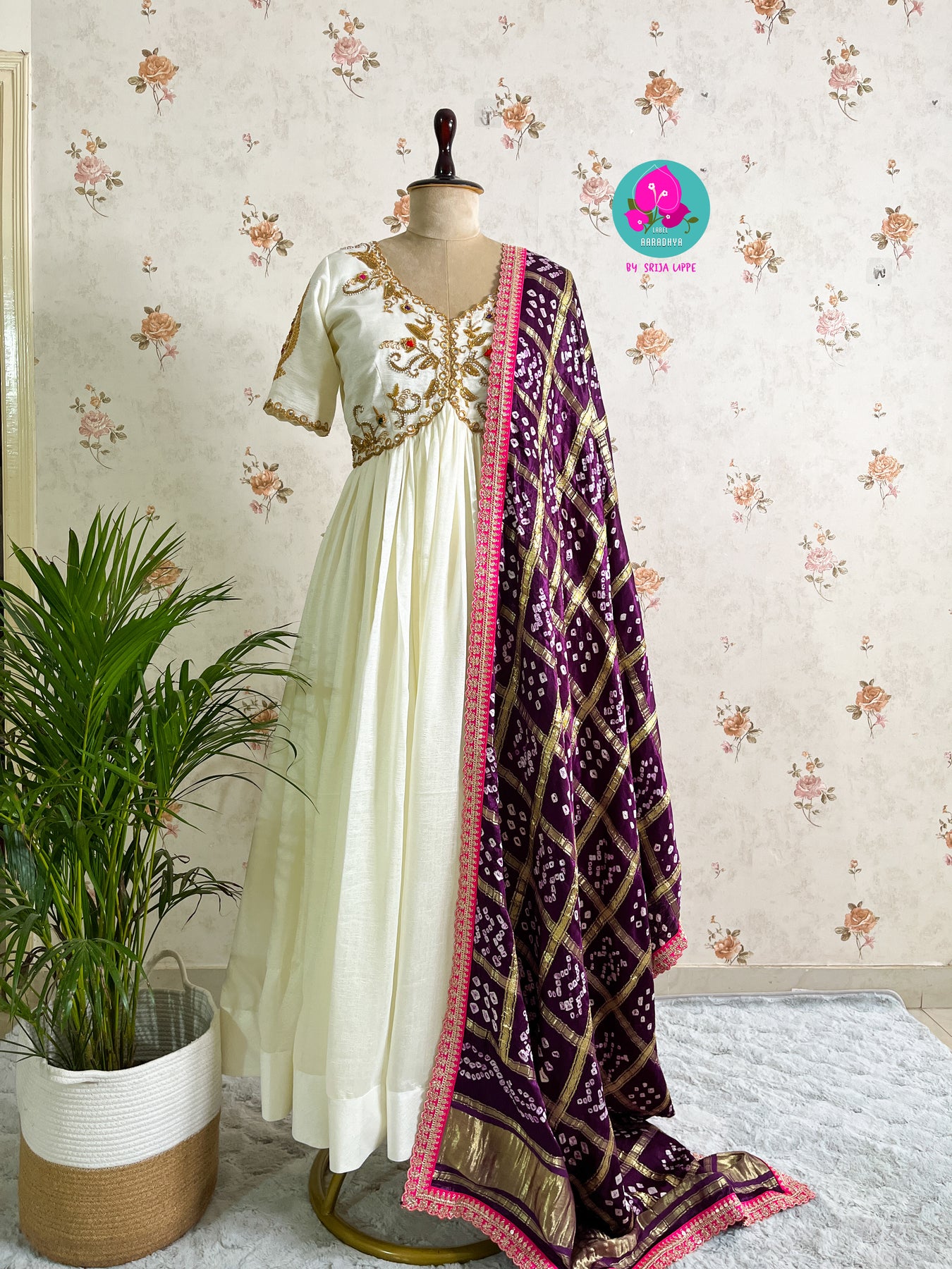 Gaji silk handmade Bandhej dupatta paired with hand embroidered Anarkali frock