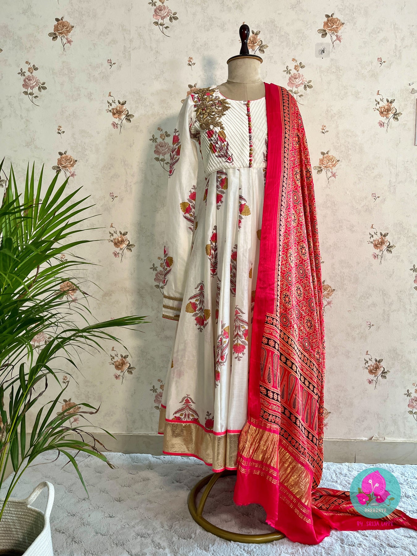 Paneled floral Chanderi silk anarkali with Ajrakh print dupatta