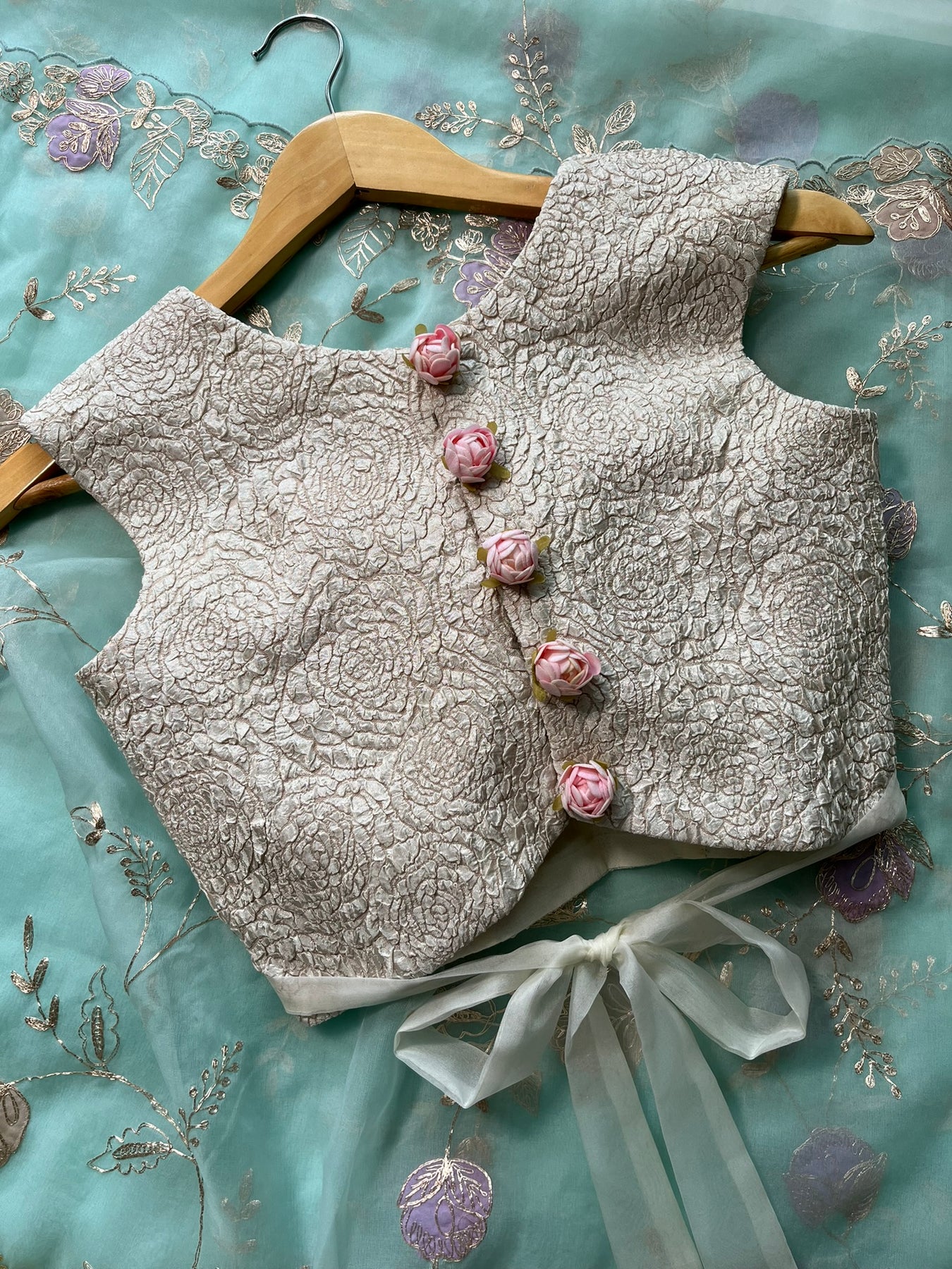 Enhance the appearance of your favorite saree with this versatile and stylish blouse in Off-White shade. Featuring a sophisticated embossed floral pattern throughout the fabric, it is the perfect addition to any fashion-conscious individual's wardrobe.
