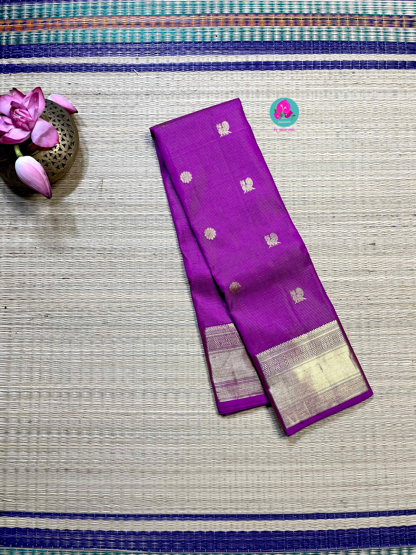 Crafted from pure Kanchipattu handloom silk, this saree is the epitome of timeless elegance. The stunning magenta shade is both vibrant and regal, making a sophisticated statement. Adorned with a delicate 1G zari voosi design, the saree showcases a subtle yet intricate pattern that adds a touch of traditional artistry without being overwhelming.