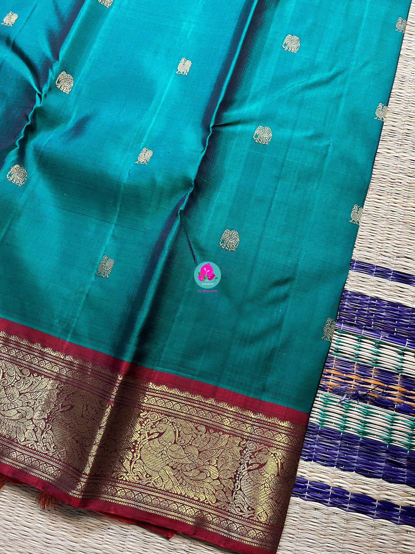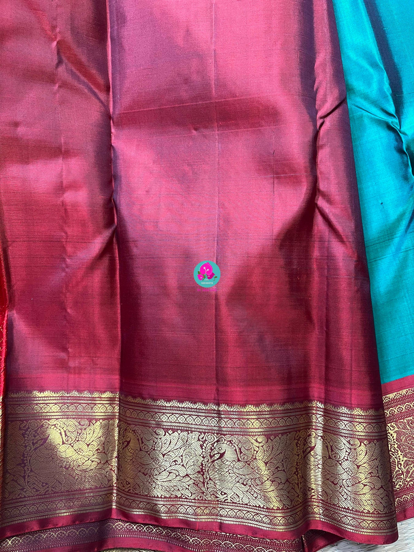 Inspired by the vibrant colors of a peacock, this pure Kanchipattu handloom saree is a testament to timeless grace. The body features a stunning peacock green shade, a color that is both regal and refreshing. This is beautifully contrasted with a rich red border and pallu, a classic combination that creates a striking and elegant look.