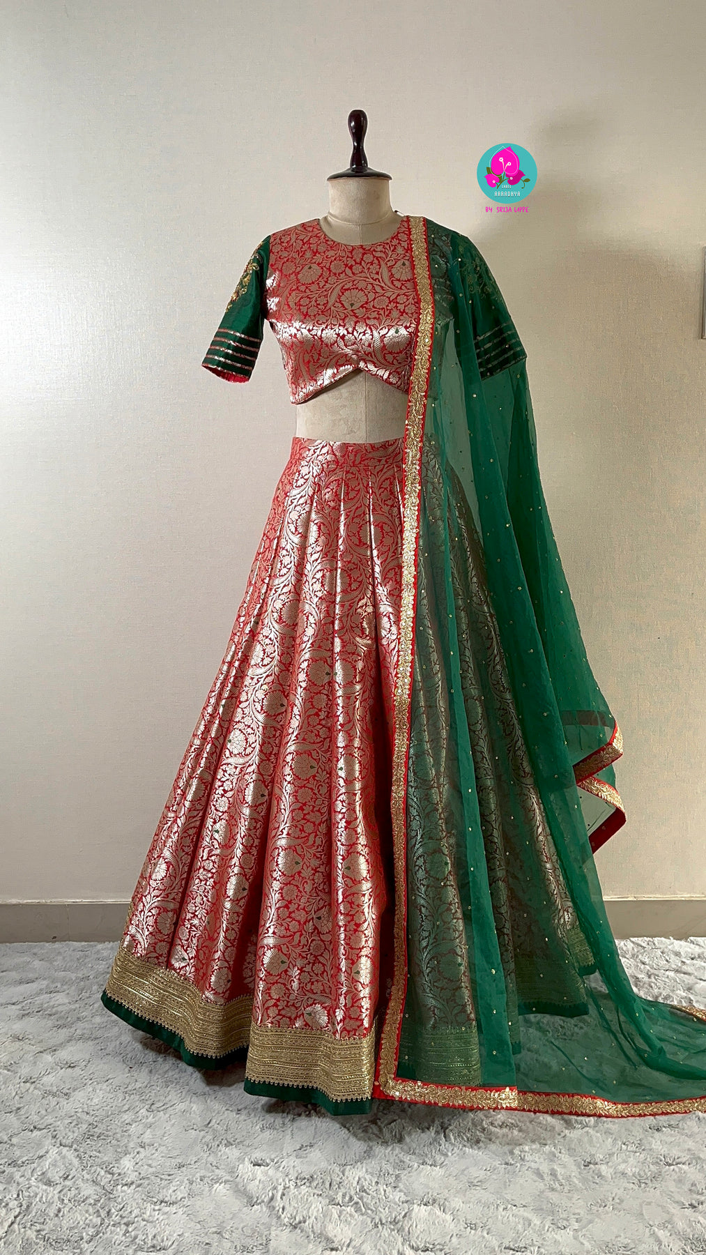 Experience the rich cultural heritage of India with our stunning Benarasi lehenga set. Made with luxurious Benarasi fabric, this set features intricate embroidery and a traditional design. Perfect for weddings and special occasions, this lehenga set will make you feel like royalty!