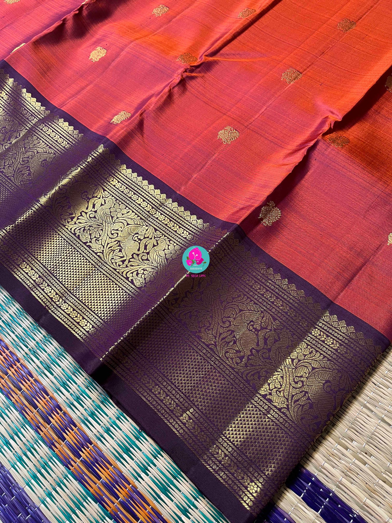 Experience timeless elegance with our 2g Zari Kanchipattu saree in rustic red maroon and dark purple. This exquisite saree features intricate zari work that enhances its luxurious appeal, perfect for special occasions and traditional celebrations. The blend of deep hues adds a sophisticated touch, while the fine craftsmanship ensures you stand out gracefully. Elevate your wardrobe with this classic piece that combines tradition with style effortlessly.