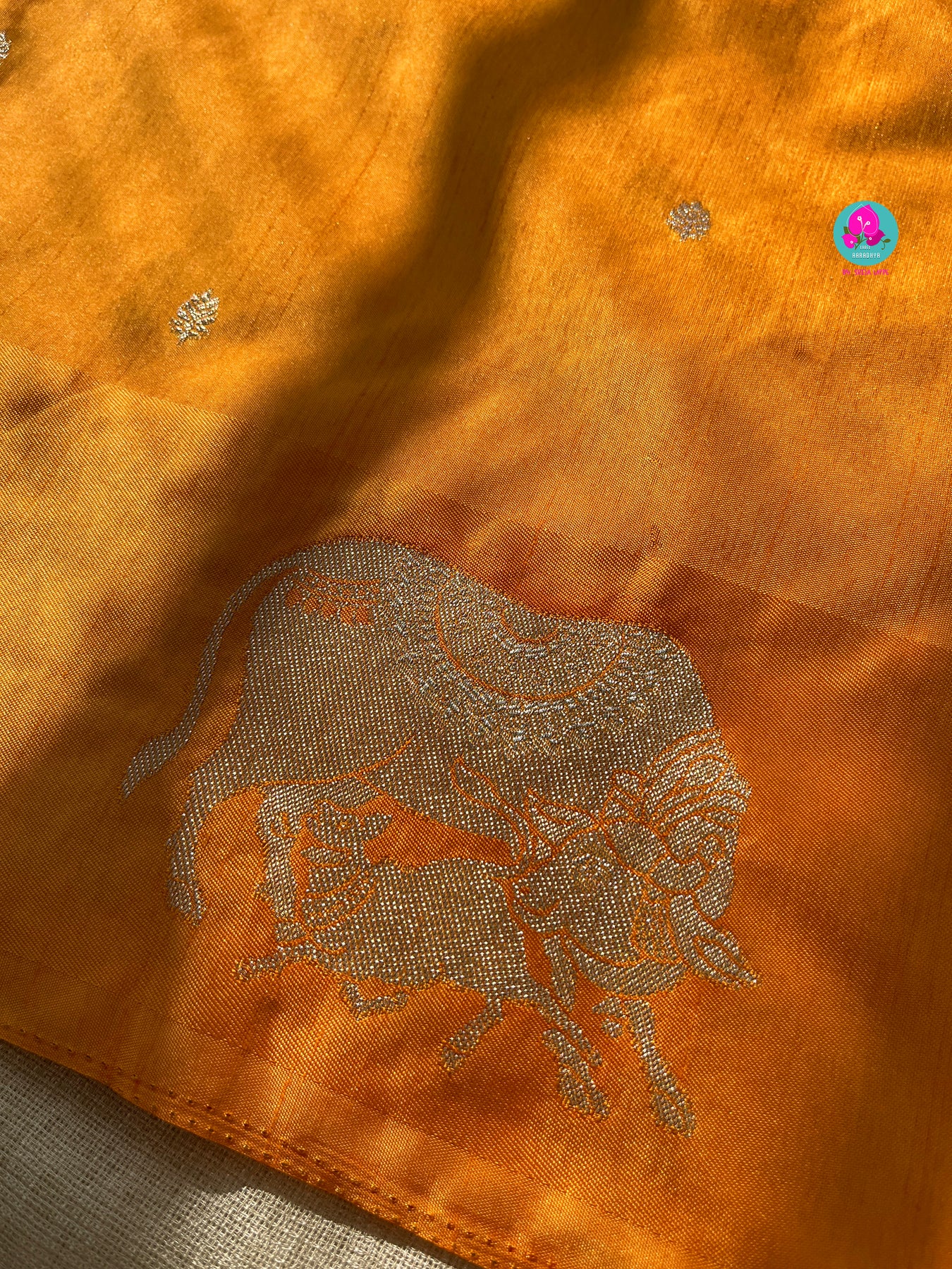 Benarasi semi raw mango silk saree with Khamdhenu weave in Tangerine color