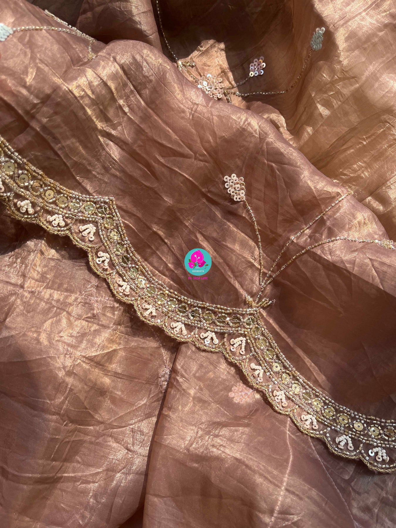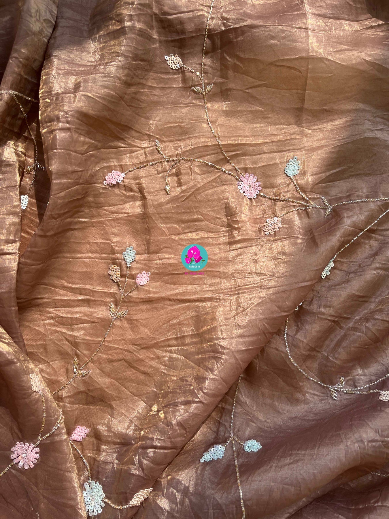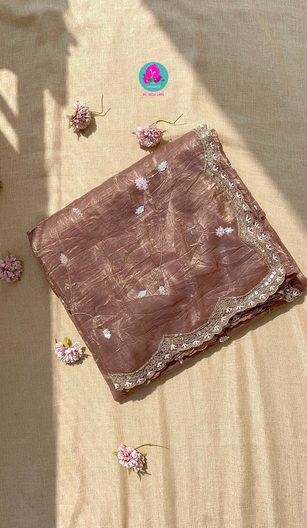 Add a touch of elegance with our hand embroidered soft crush organza saree. Perfect for any occasion, this saree is beautifully crafted for a flawless look (guaranteed to turn heads)! Available now for a limited time.