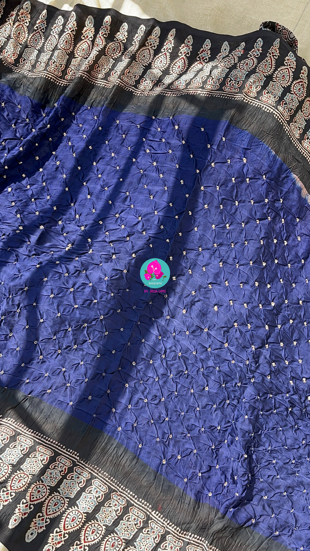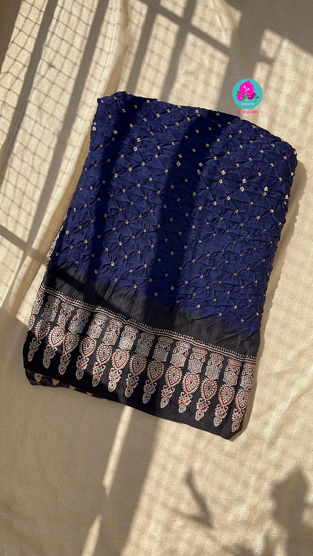 Hand made Bandhani design on pure modal silk fabric and ajrakh block print (using vegetable dyes)