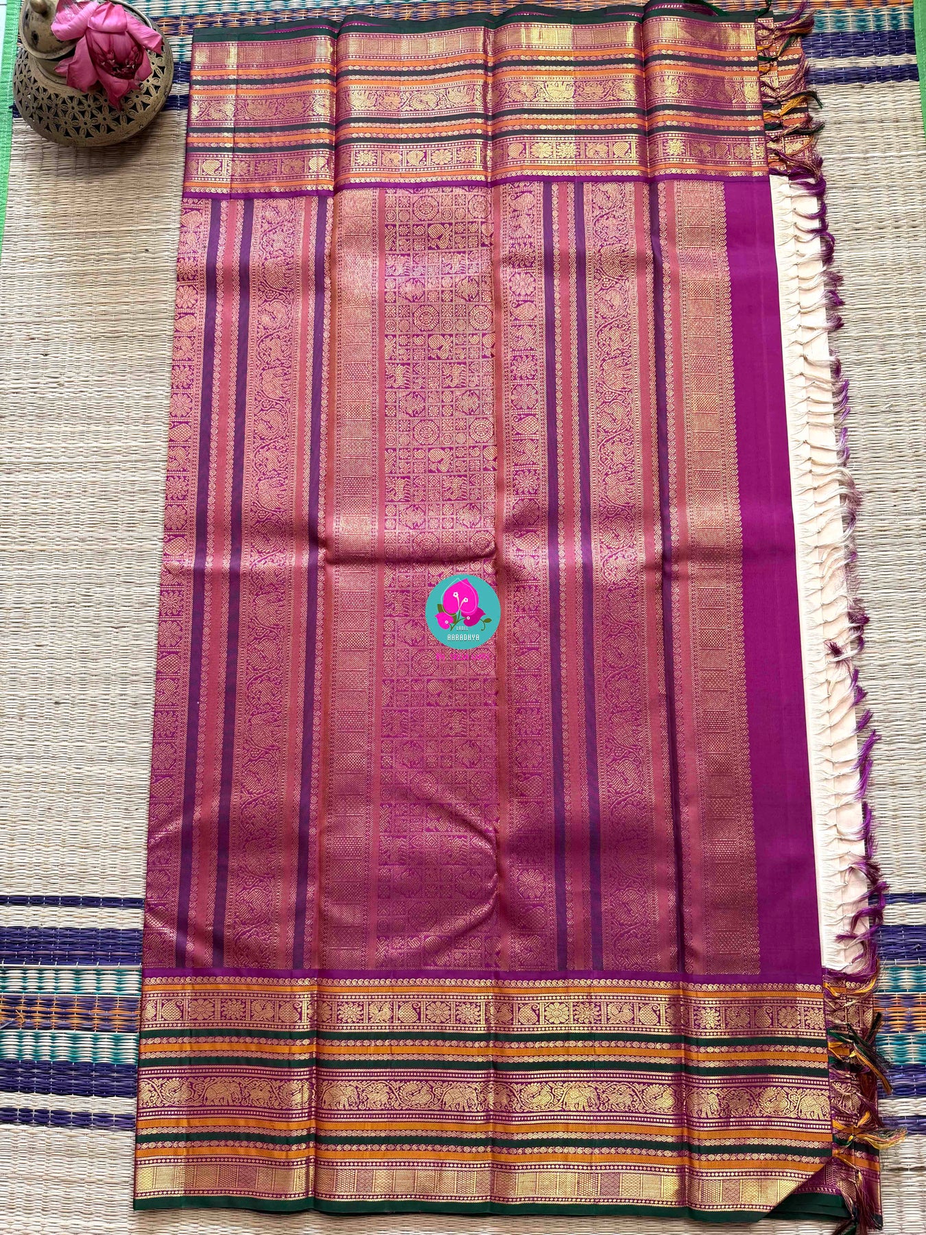 This drape is a treasure, for the most splendid of days, A luxurious vision, amidst golden rays. Would you like an attractive heading for this purple and pink Kanchipattu saree?