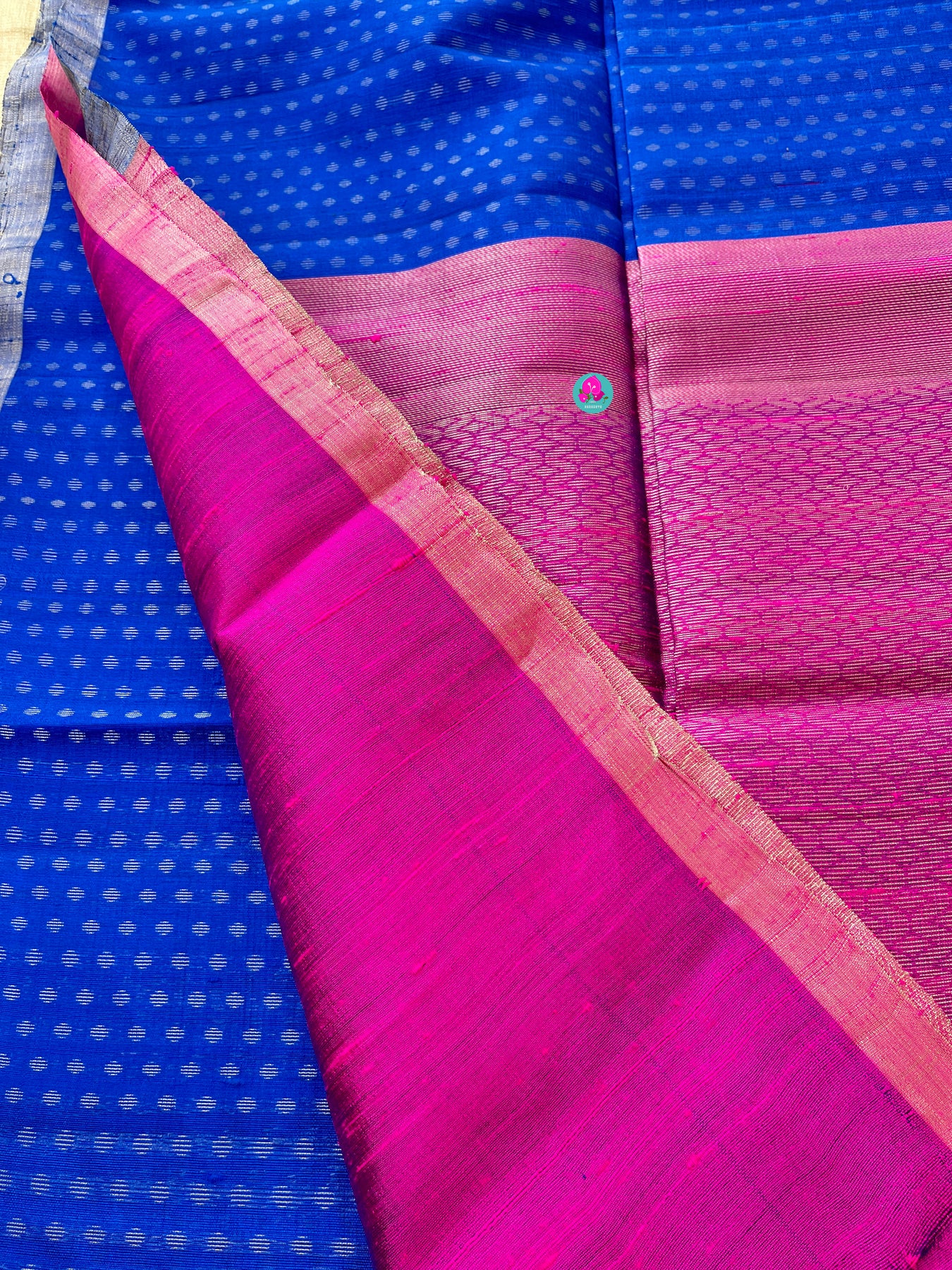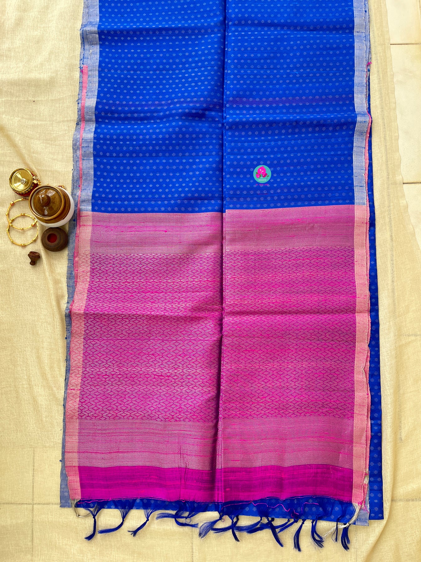 This pure khadi silk handloom saree in royal blue is a perfect choice for traditional events. This timeless handloom ensures utmost comfort throughout the day. This beautiful saree comes with a plain pink blouse piece.