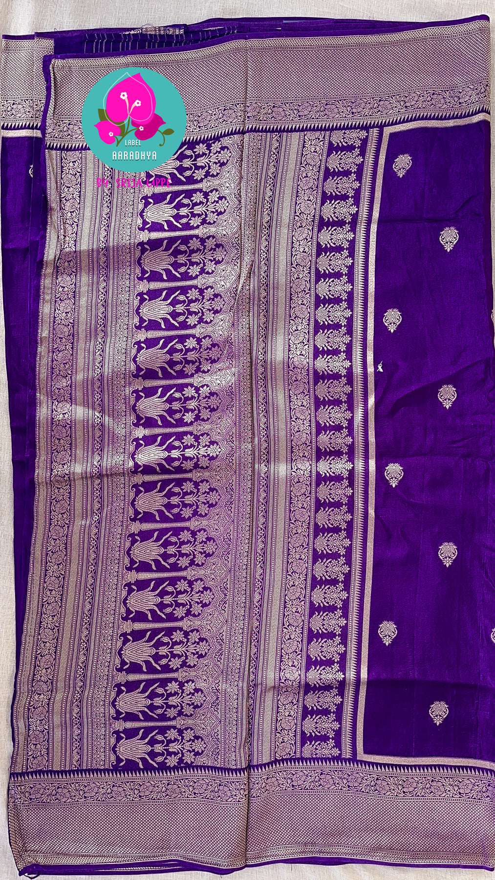 Made from luxurious Russian Silk, this deep purple Saree is the epitome of elegance and sophistication. This Saree is perfect for any formal event. Upgrade your wardrobe with this stunning combination of rich fabrics and bold colors.
