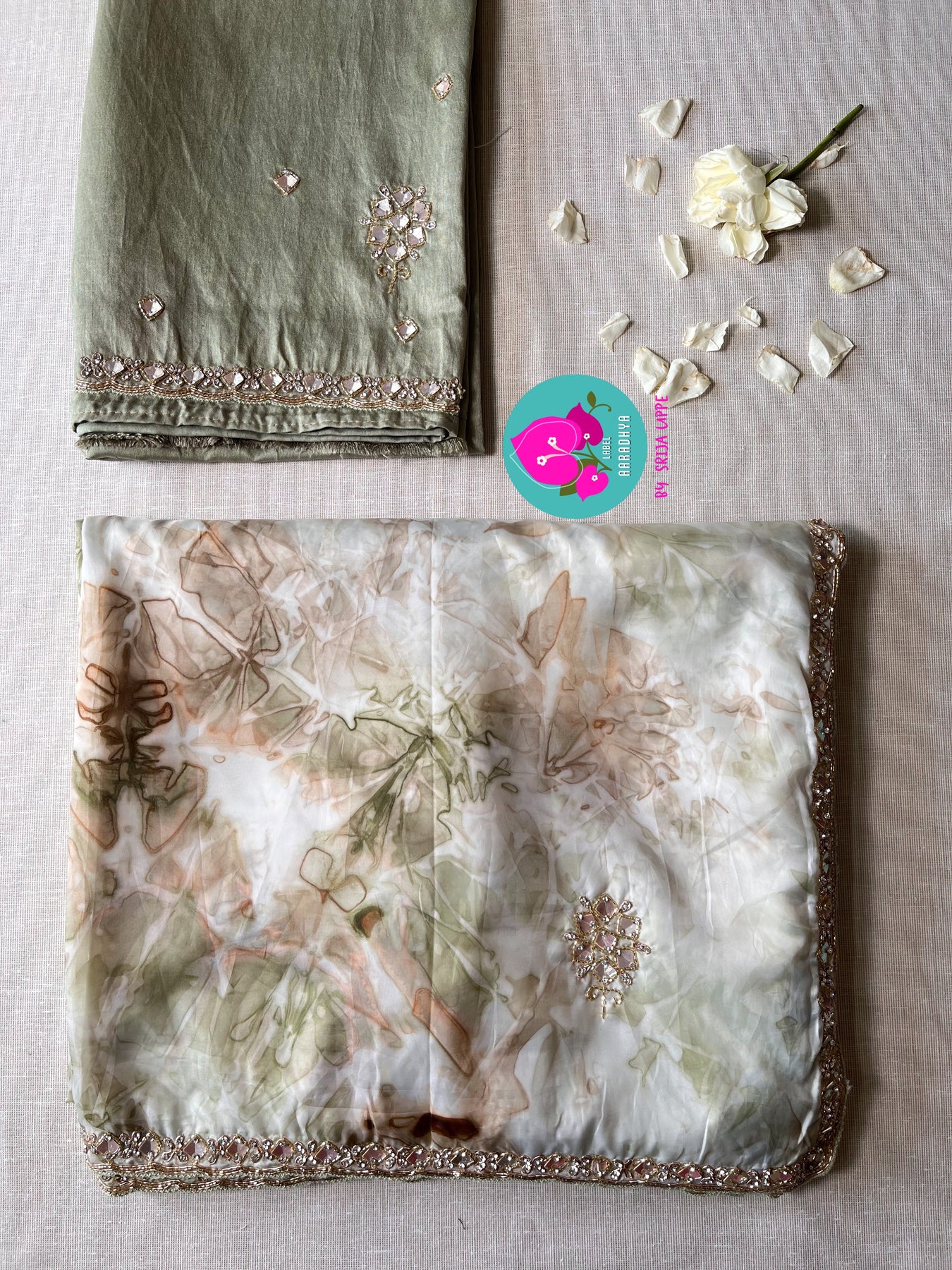 Satin Georgette saree with hand dyed shibori deisgn is soft & very hard to miss. This unique saree has hand embroidered scalloped border. This saree comes with a plain hand embroidered rawsilk blouse piece.