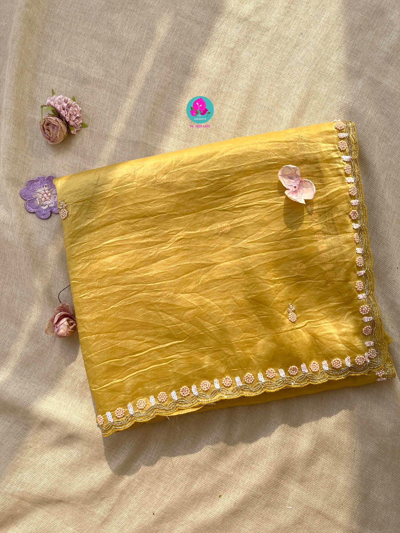 Elevate your style with our Soft Crush organza saree intricately hand-embroidered for a luxurious touch. The soft and flowy fabric adds a touch of elegance to your outfit, making it perfect for any occasion. Turn heads and make a statement with this unique saree.