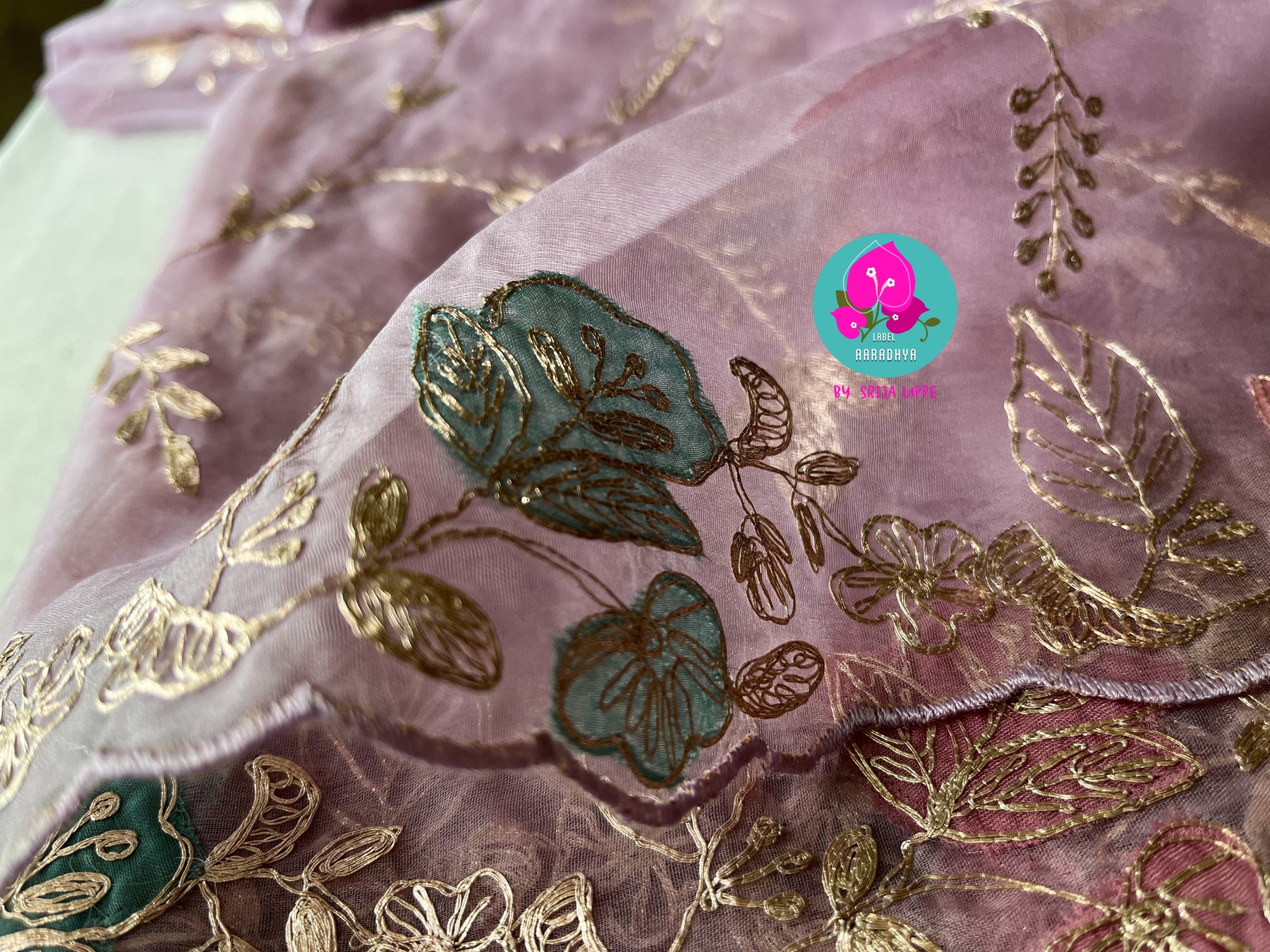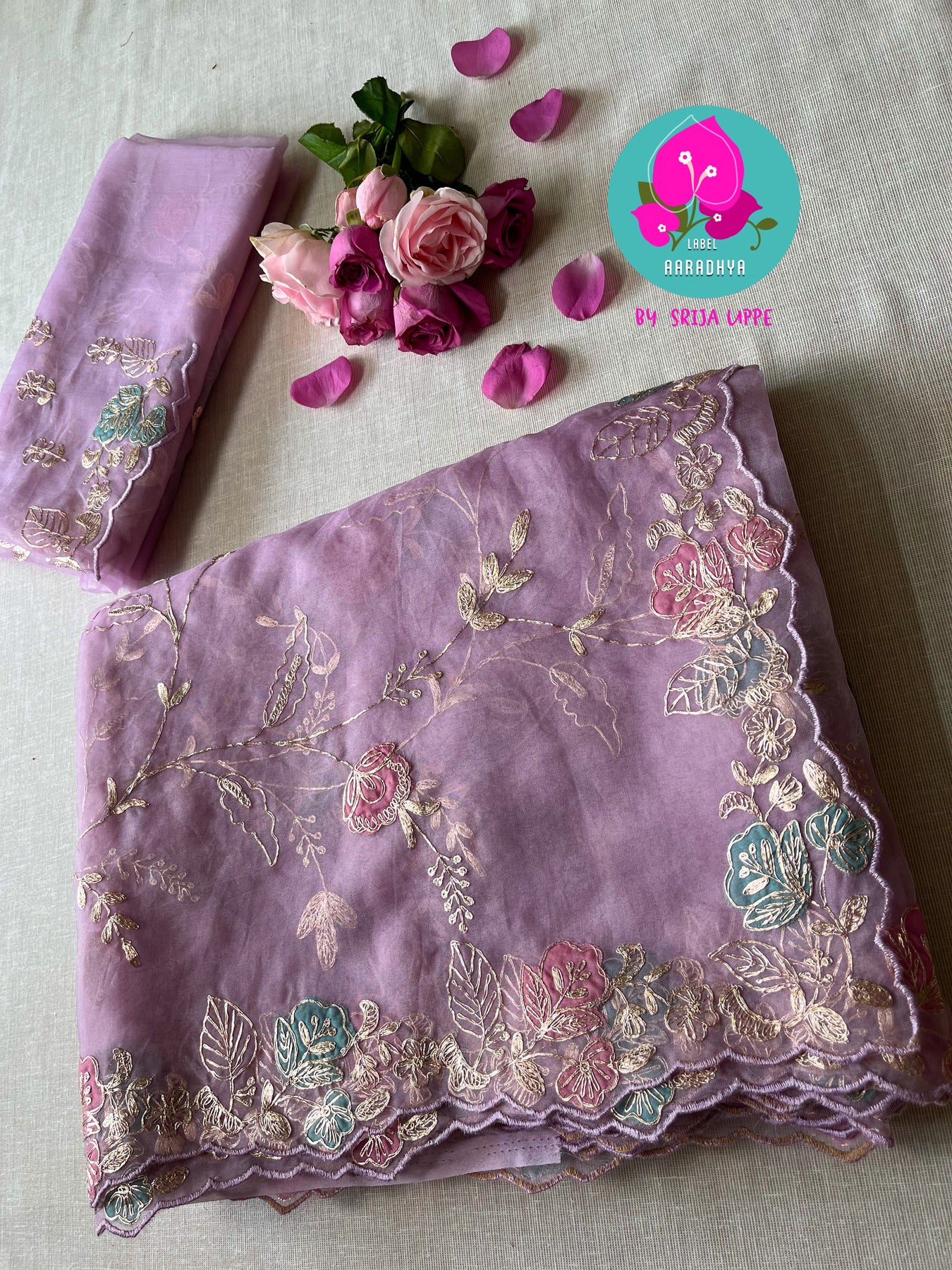 Soft Organza saree in dark lavender comes with timeless applique work combined with handmade pitta work. This beautiful pastel saree comes with a hand embroidered blouse piece.