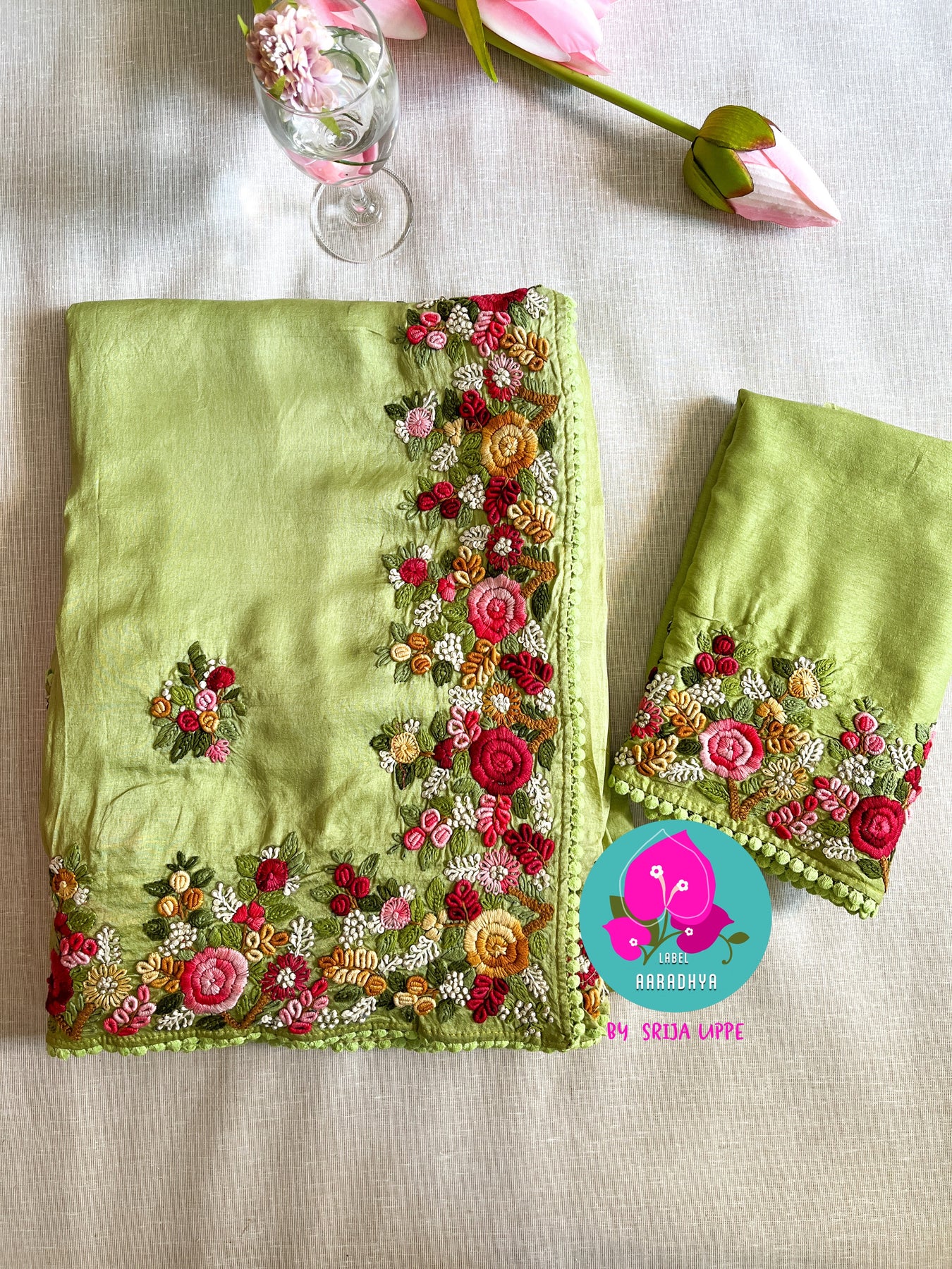 A stunning combination of hand crafted bullion stitch, parsi work and bullion knot embroidery on the saree is made by master artisans. This soft Russian silk saree in Pastel green shade is a true labour of love.