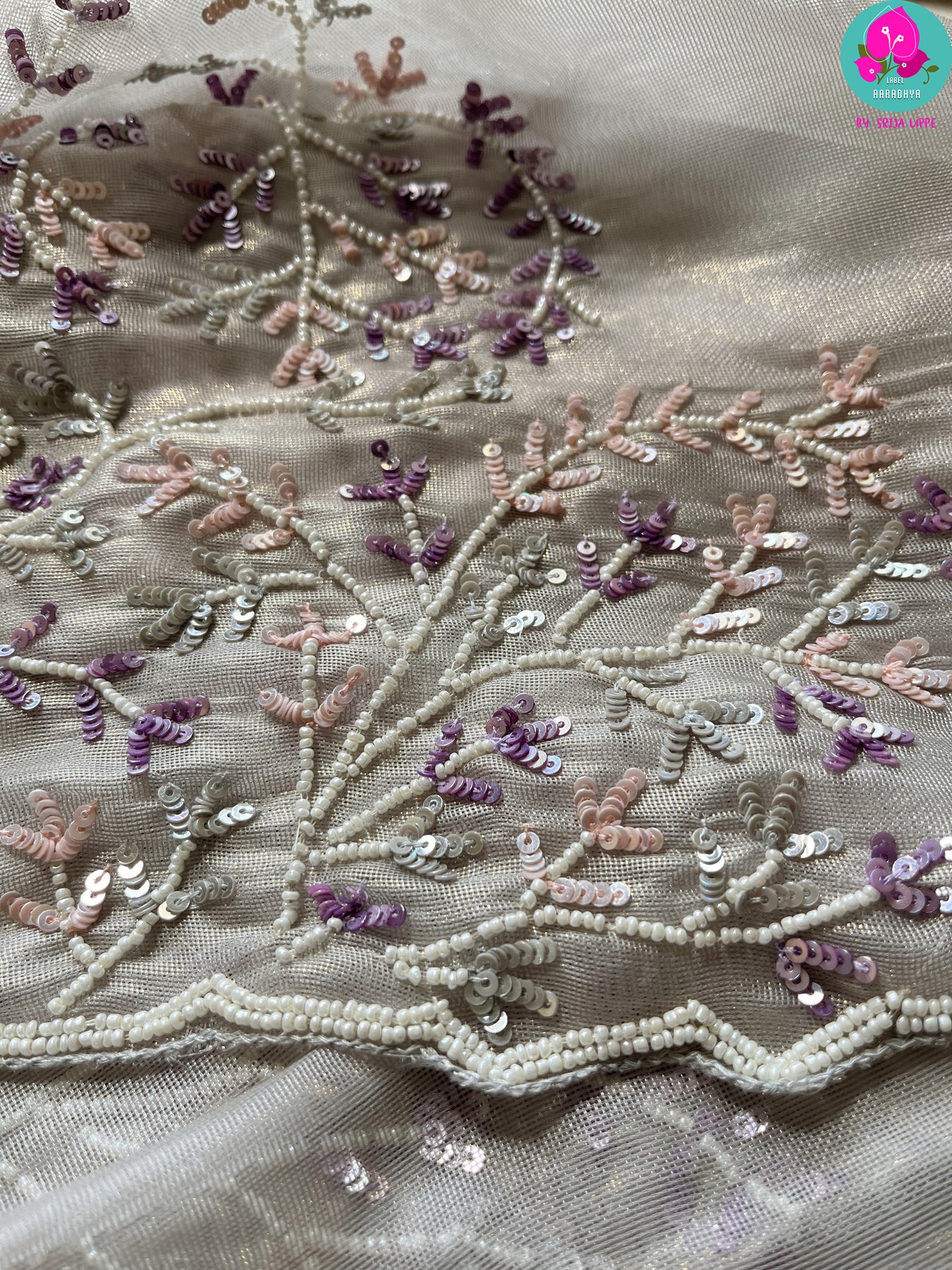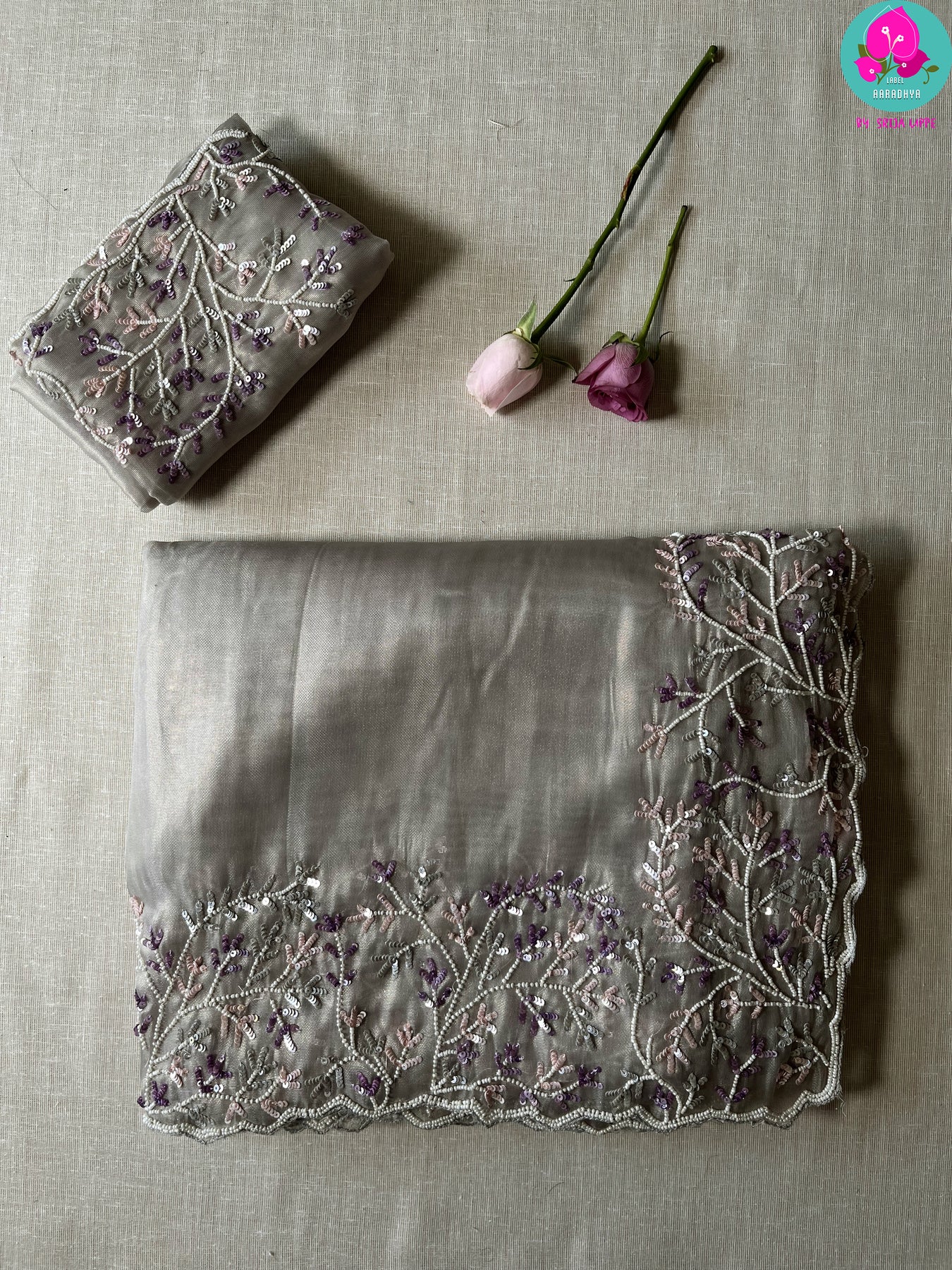 Soft tissue grey saree with embroidered sequins work at the border. It comes with a hand embroidered blouse piece in the same fabric