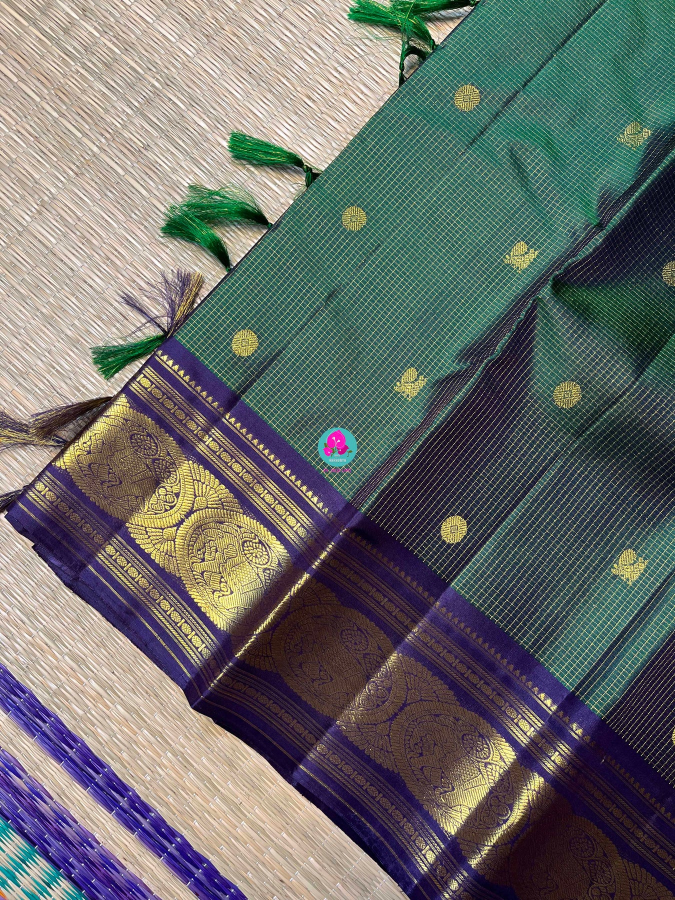 Wrapped in the timeless elegance of tradition, this exquisite Kanchipuram handloom saree is a true masterpiece. The body features a rich sage green hue that is both classic and sophisticated.
