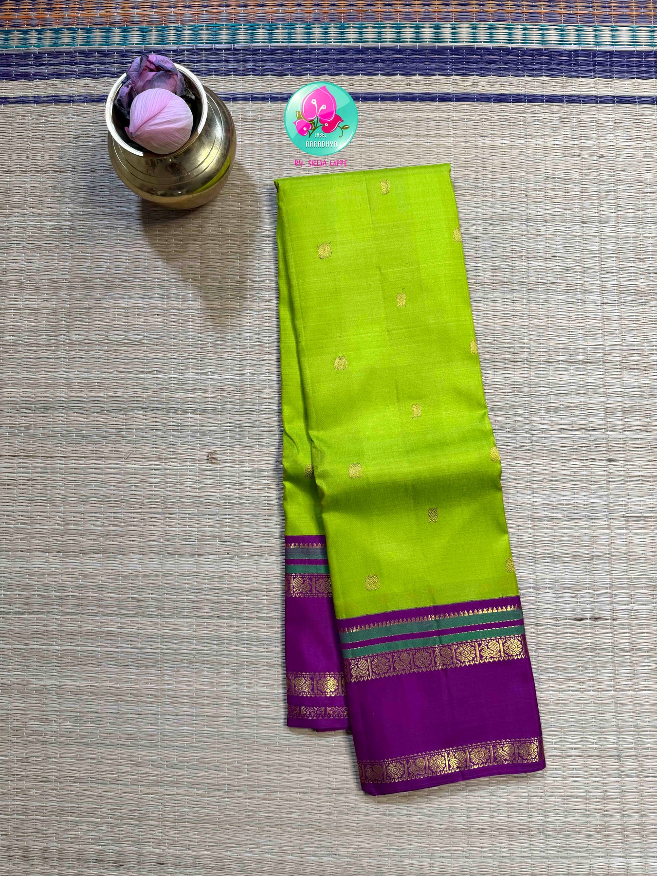 A Drape of Tropical Dawn Step into the luminous glow of a sun-drenched grove. This Pure 2G Kanchipattu in a vibrant Parrot Green is a masterclass in refreshing elegance. Like the first leaves of spring, the silk carries a brilliant, life-affirming luster that captures the light with every graceful movement, offering the signature architectural drape that defines a Label Aaradhya heirloom.
