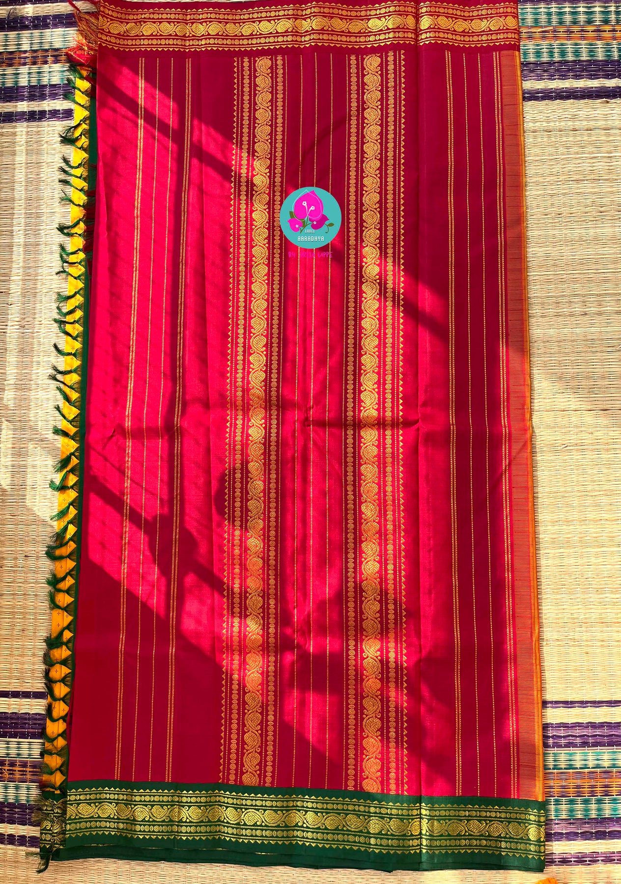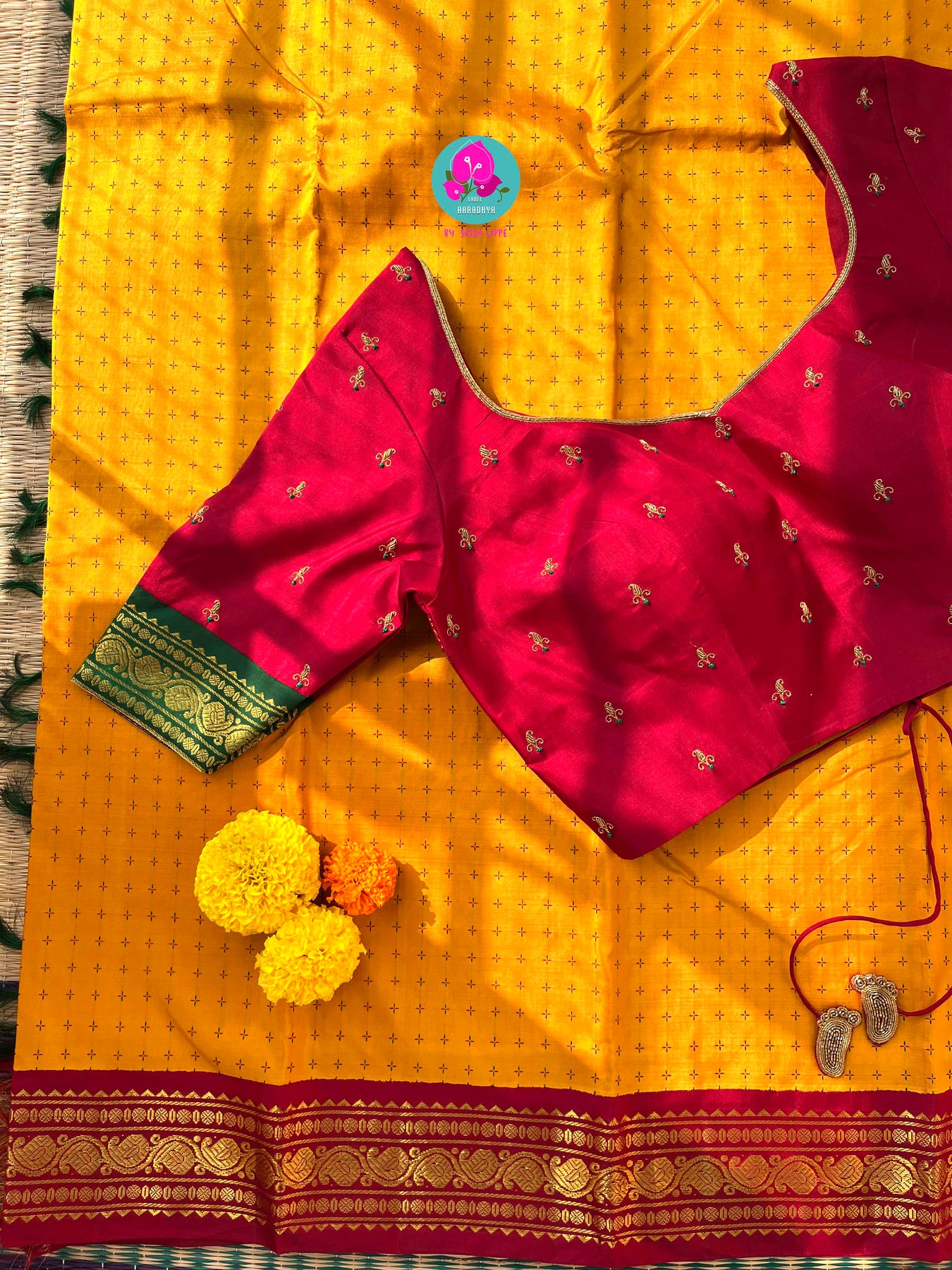 A sun-kissed marvel, a promise so grand, The saree emerges from Kanchipattu's rich land. The body, a vibrant mustard yellow, glowing so bright, With delicate woven textures, catching all light. This is the revered "Srimantham Saree" divine, Symbolizing new life, a blessing so fine. Woven in Vintage Kanchipattu Silk, light and so free, It offers the wearer dual magic to see.