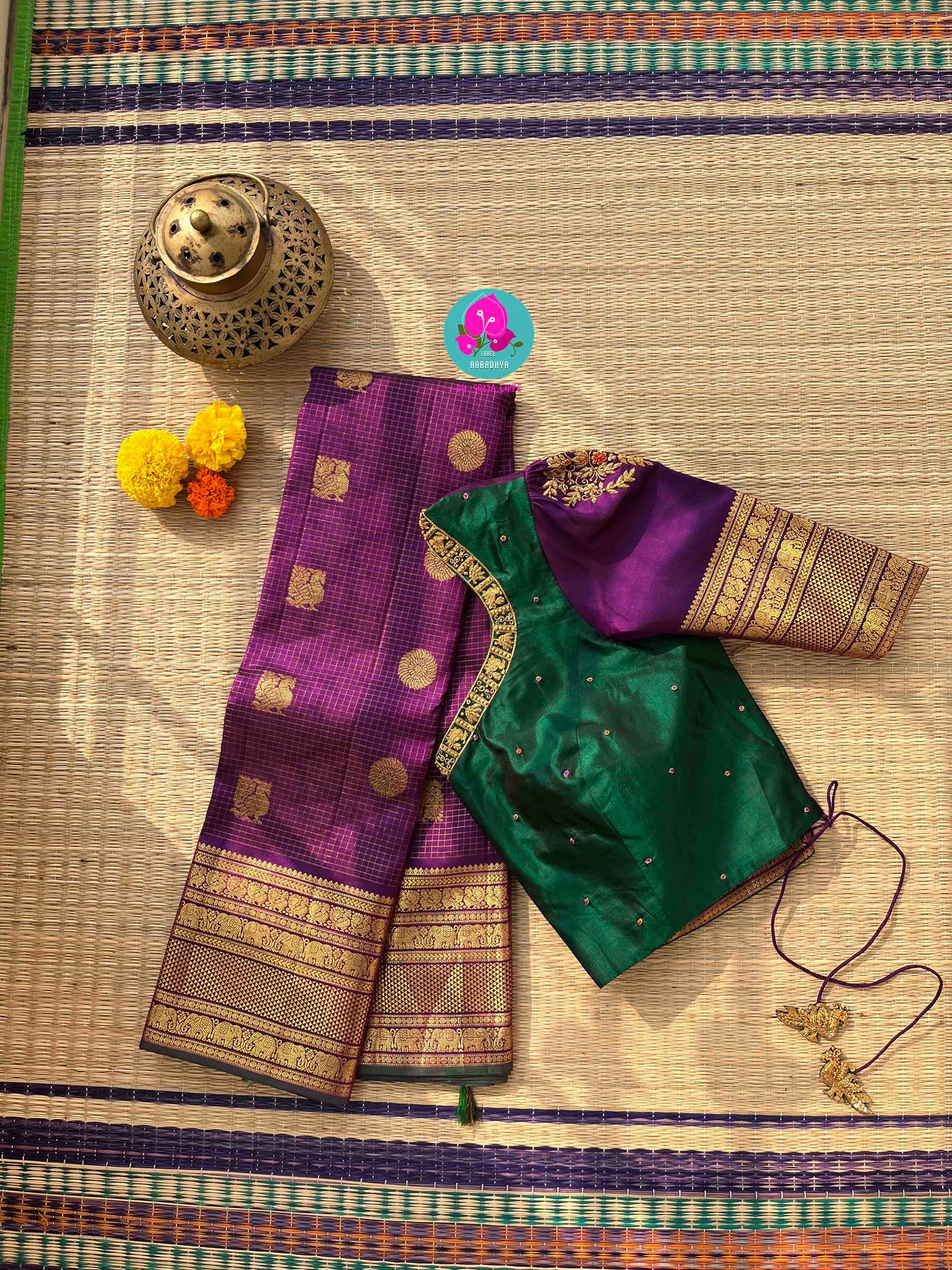 And perfectly paired, in a luxurious, woven design, The blouse boasts a dual shade, truly divine. The body, a deep, rich forest green so lush, Adorned with hand-stitched gold, in a passionate rush. The puff-sleeves ascend, in a vibrant aubergine purple hue, Mirroring the saree's deep color, exquisitely new. The neckline adorned with hand embroidery's deep gleam, A pattern of gold, like a magnificent dream.
