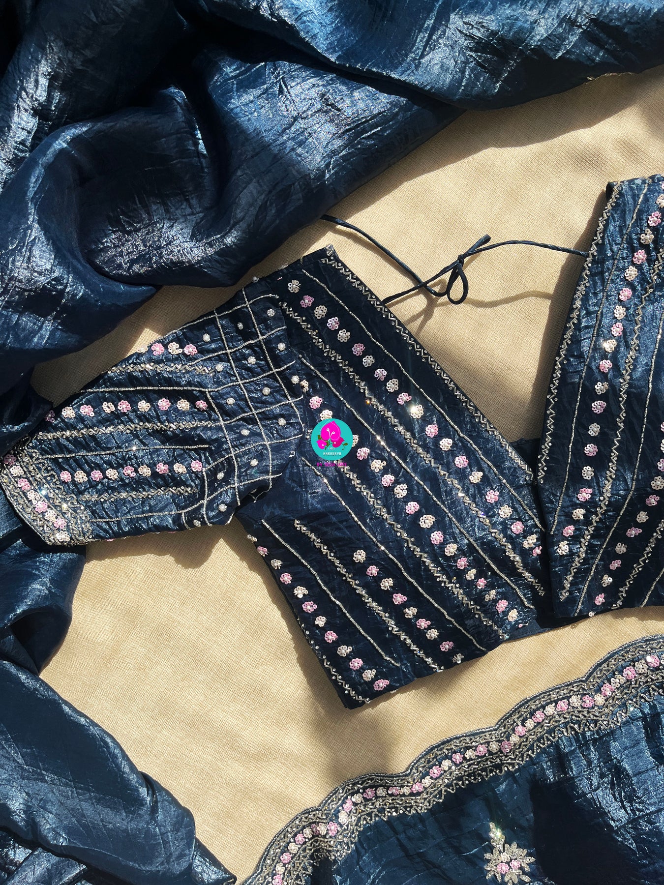 Crushed satin silk saree with sequins embroidery paired with Crushed satin sequins blouse