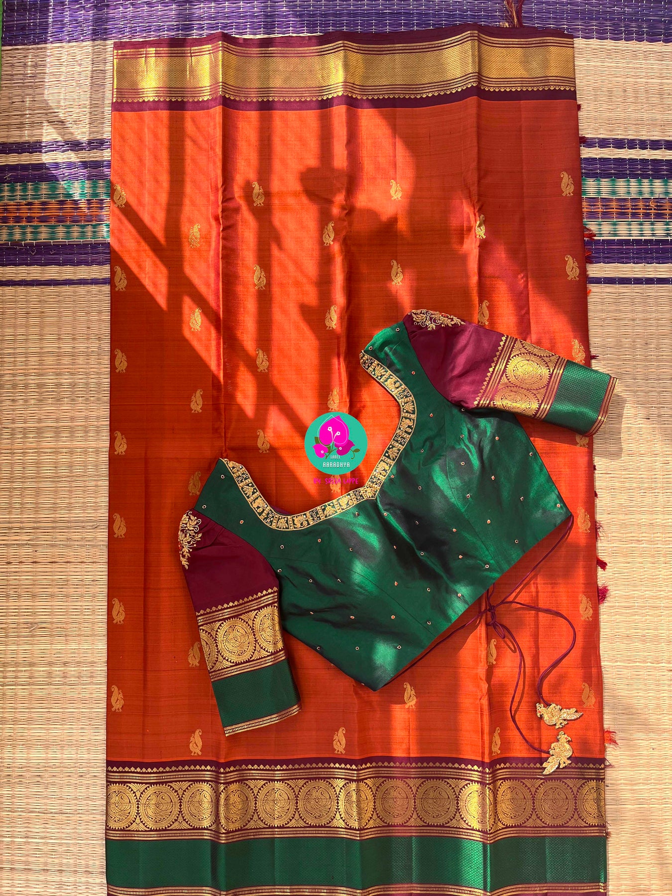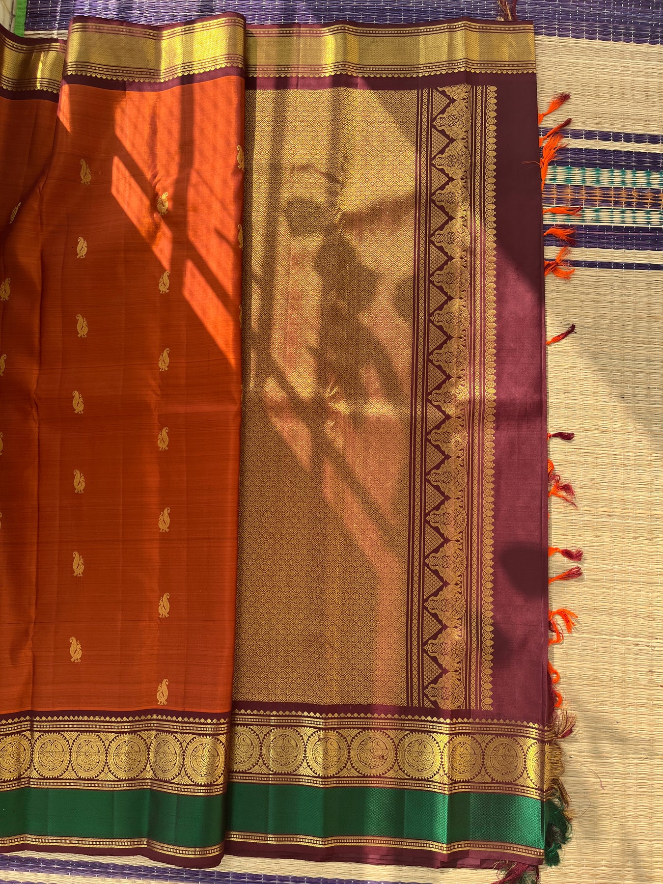 Kanchipattu handloom saree warm rust orange by a contrast border in sophisticated brown and a touch of vibrant green