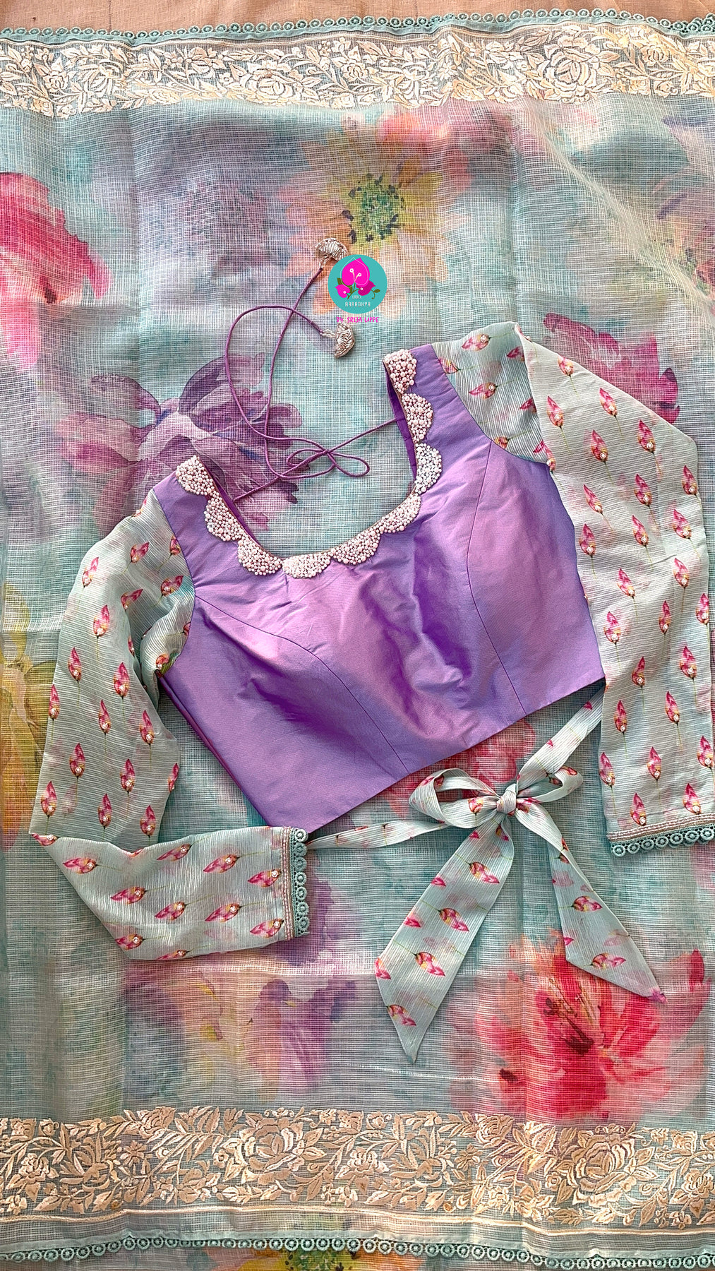 Add a touch of whimsy to your wardrobe with our Kota silk saree. Delicately embroidered borders and a pretty floral design create a truly unique piece. Perfect for any occasion, this saree combines elegance with playful charm. (No need to be serious with this one!)