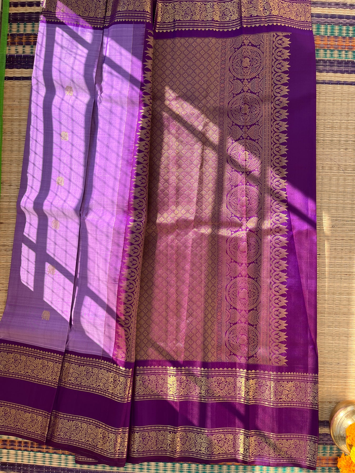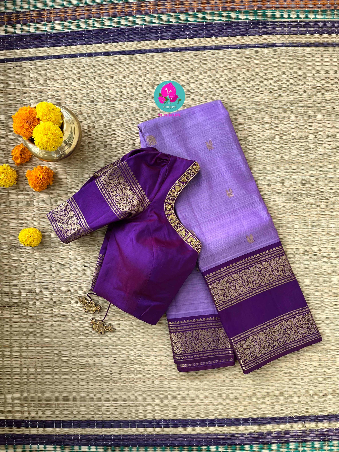 This drape is a treasure, for the most splendid of days, A luxurious vision, amidst golden rays. Would you like an attractive heading for this stunning Lavender and Royal Purple Kanchipattu Saree?