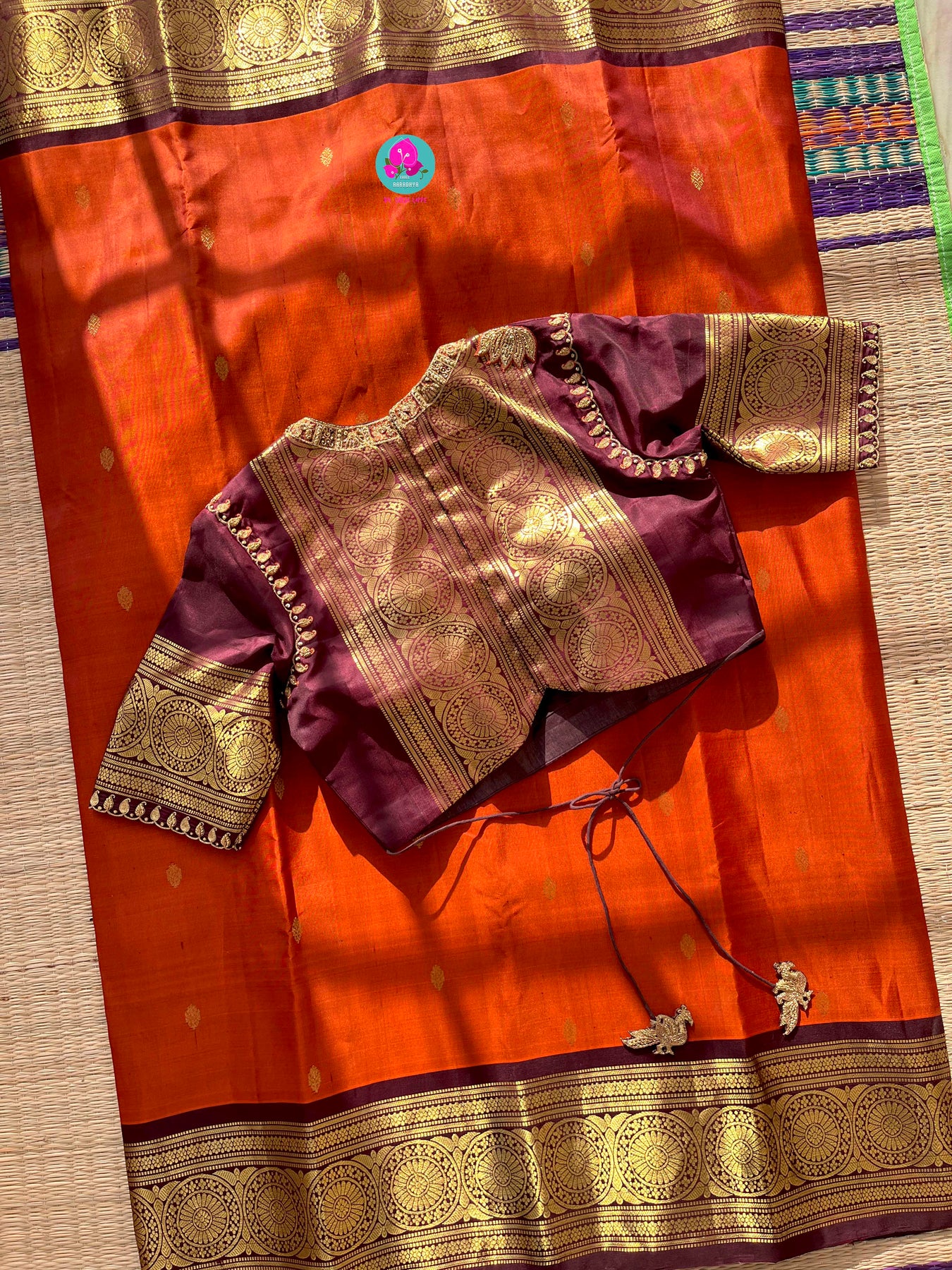 Pure Kanchipattu saree in vintage rust orange and brown border with hand embroidered blouse