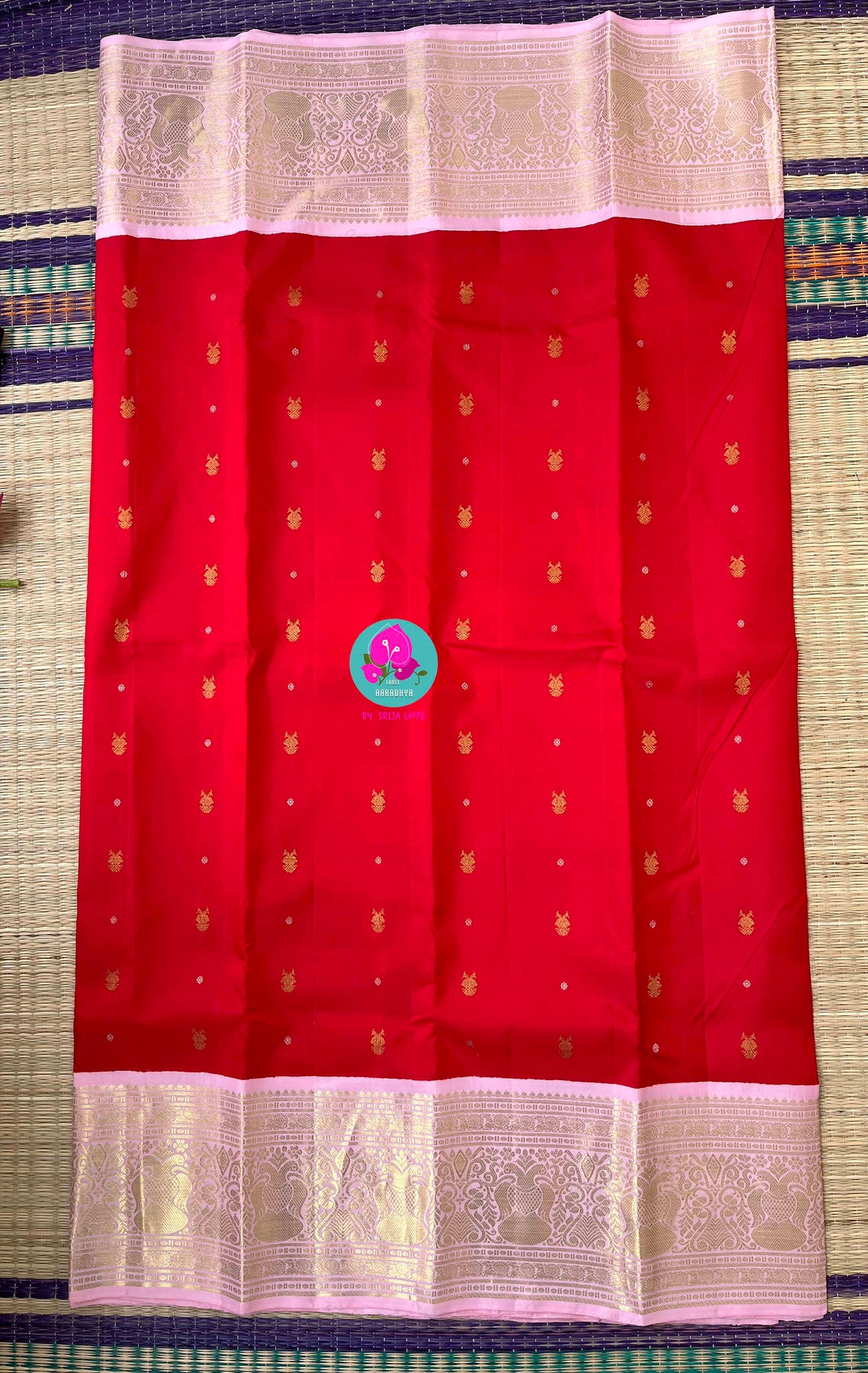 Pure Kanchipattu Red Saree with Hand embroidered Pink blouse