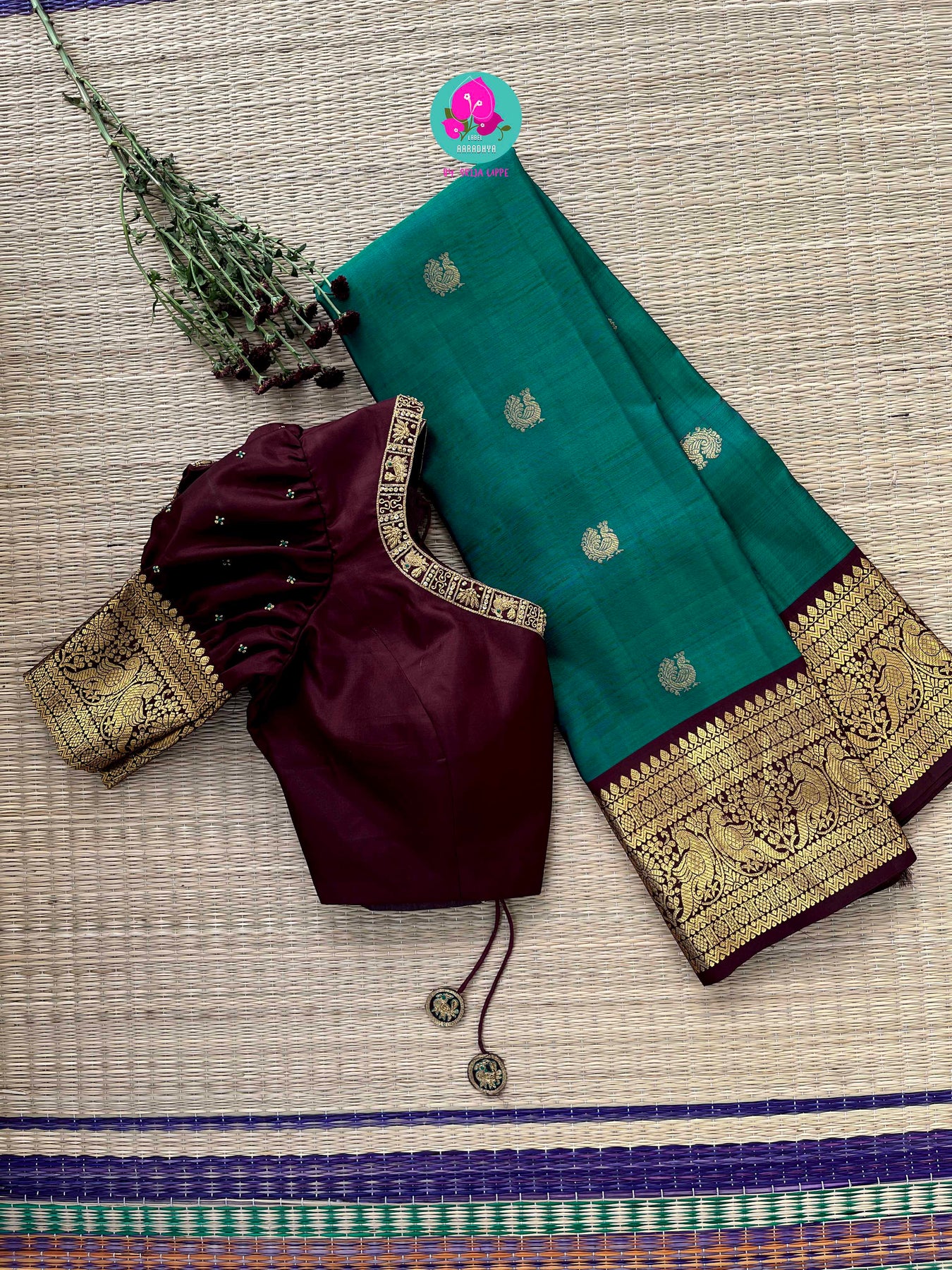 Pure Peacock green Kanchipattu handloom saree with hand embroidered long sleeves blouse