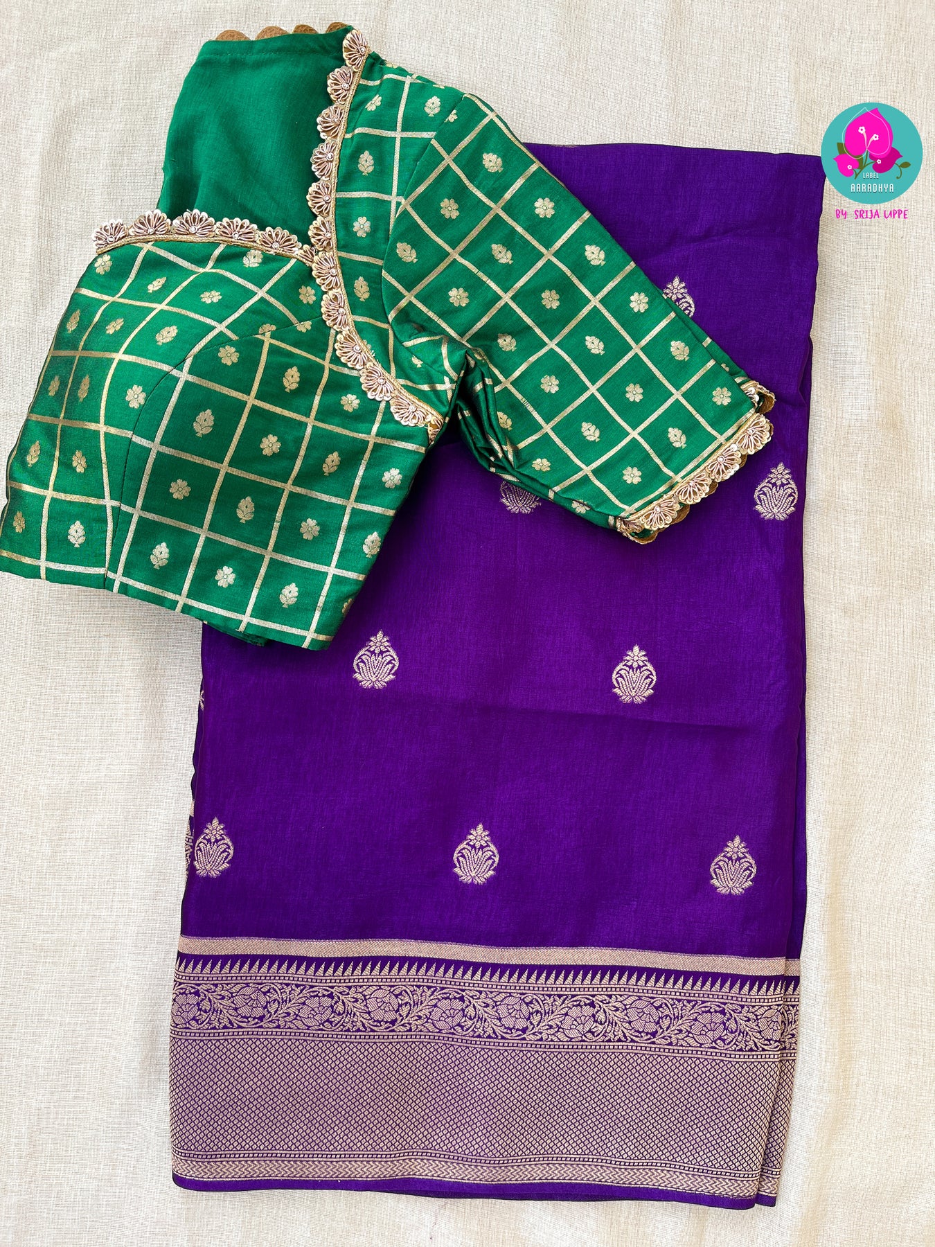 Russian Silk deep purple Saree with green Banarasi Checkered blouse