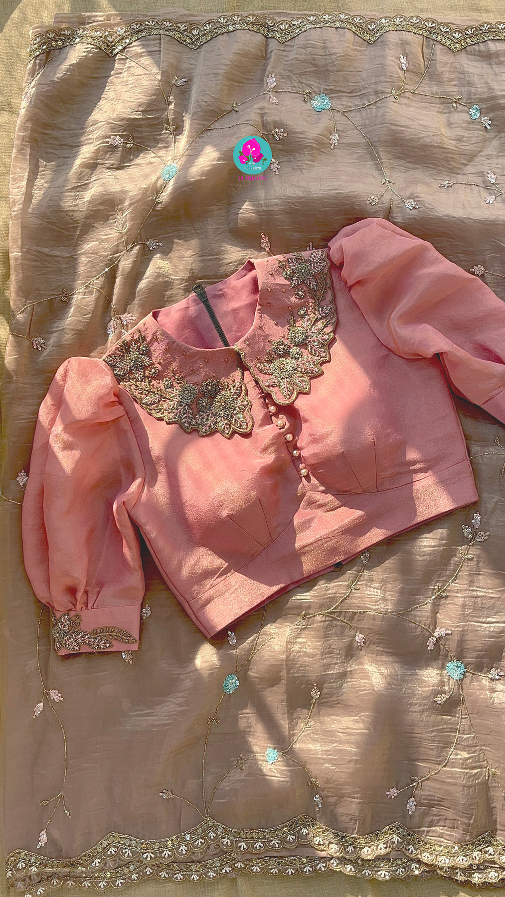 Soft crushed organza hand embroidered saree paired with Hand Embroidered tissue silk blouse