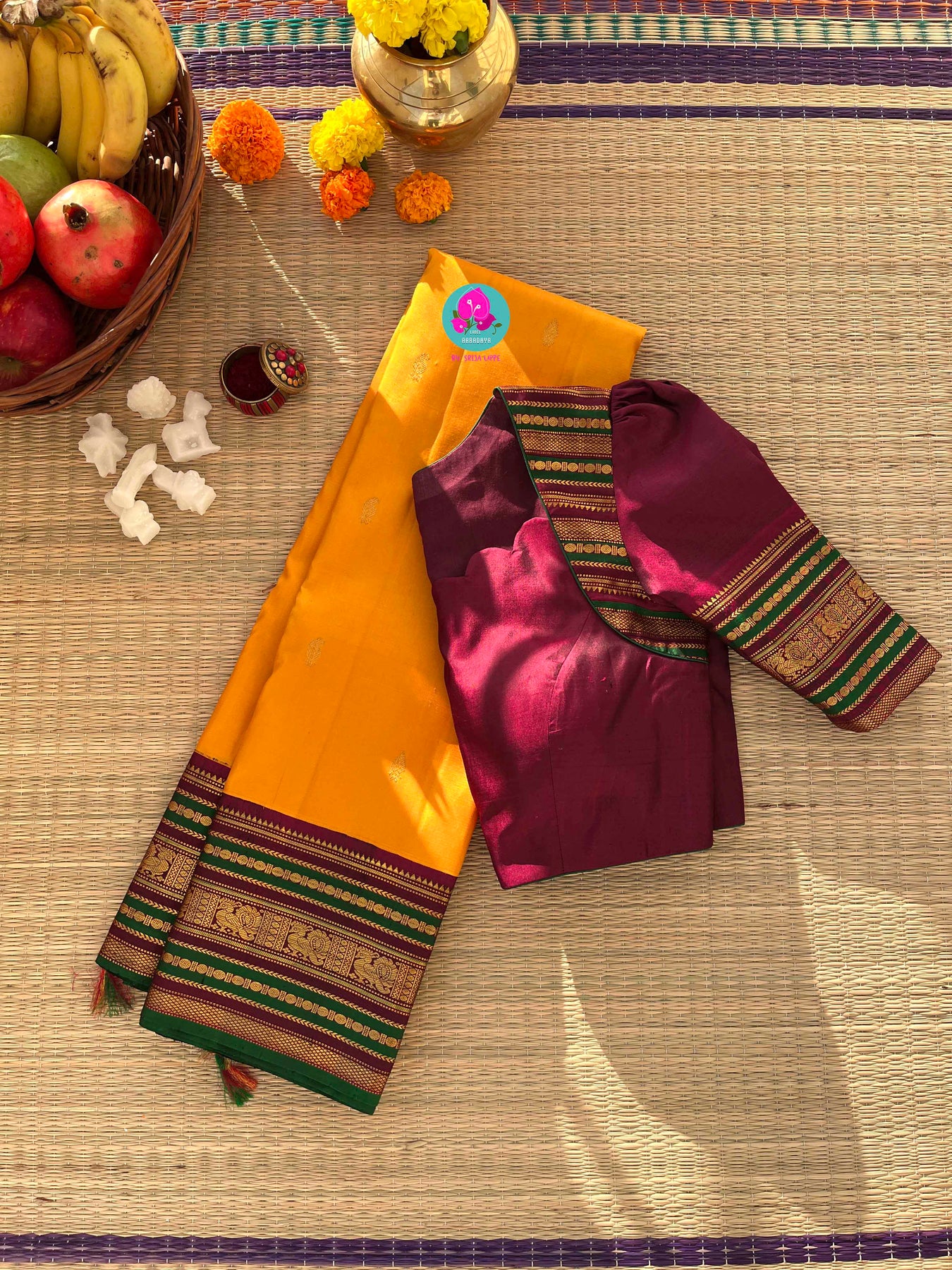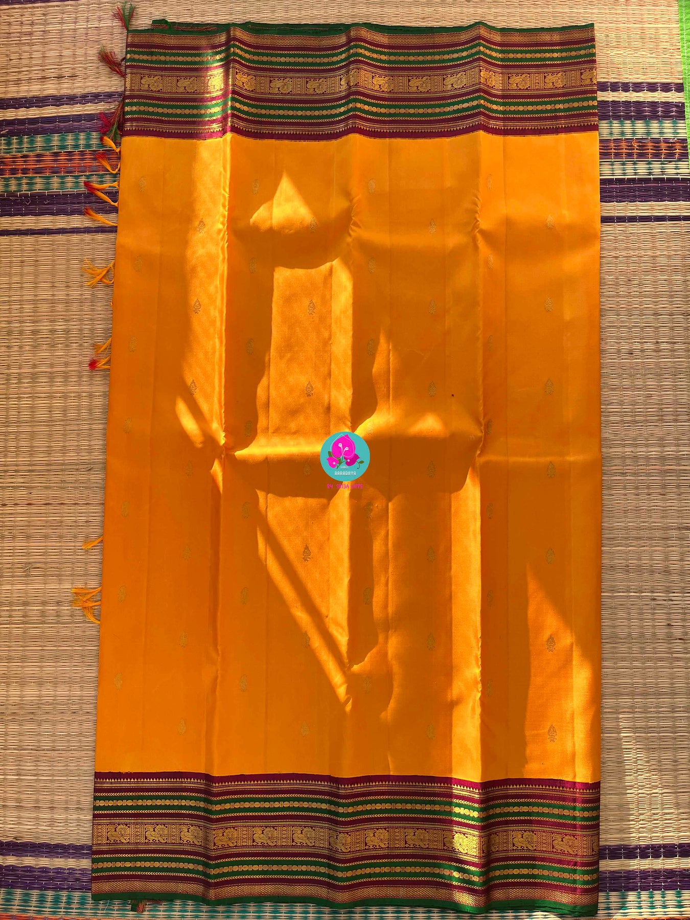 A burst of bright joy, like a sunbeam so grand, The saree unfolds, from the Kanchipattu land. The body, a radiant mustard yellow, vivid and true, Woven in pure handloom silk, just for you. Fine golden motifs, like embers of old, Are scattered across it, a rich story to be told.