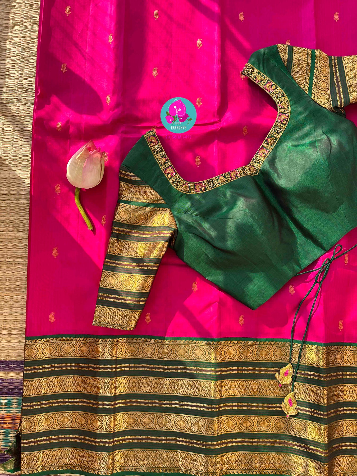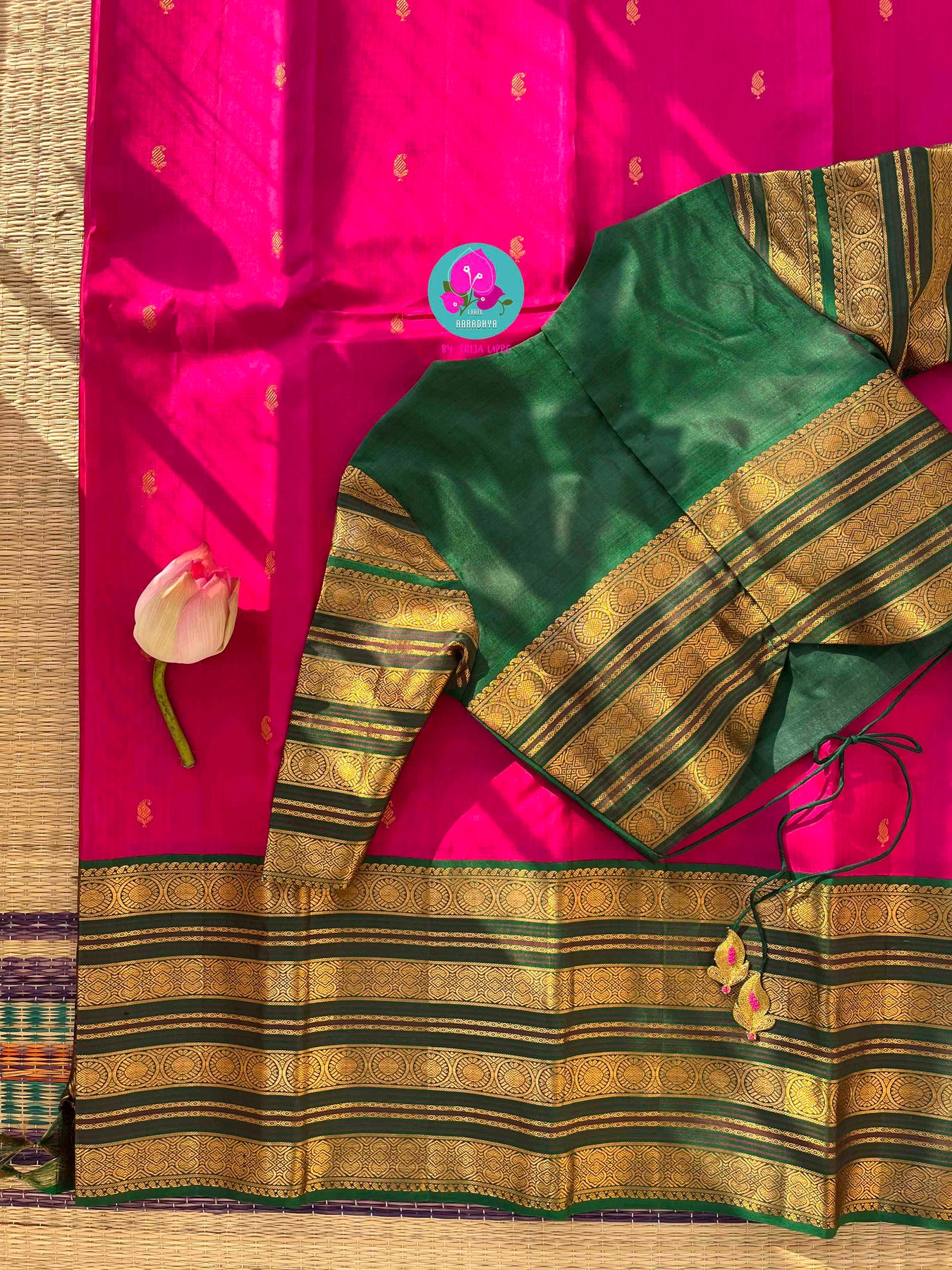 A lotus in bloom, a color both vibrant and pure, The saree emerges, a beauty that will endure. The body, a magnificent Tamara flower color (a rich, bold rani pink/fuchsia), so keen, A Kanchipattu canvas, a luxurious scene. With tiny golden mango motifs, like blessings so sweet, Are scattered across the silk, making the look complete.