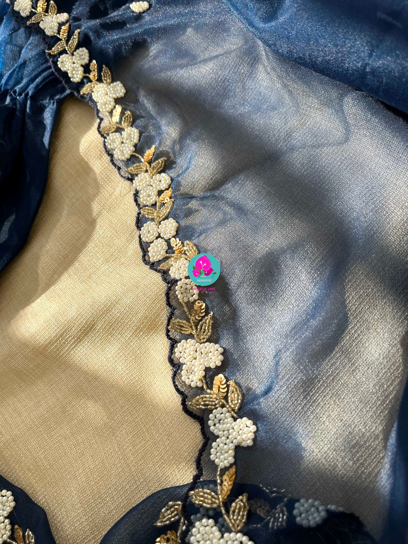 What elegant evening event do you envision wearing this hand-embroidered navy blue organza saree for?
