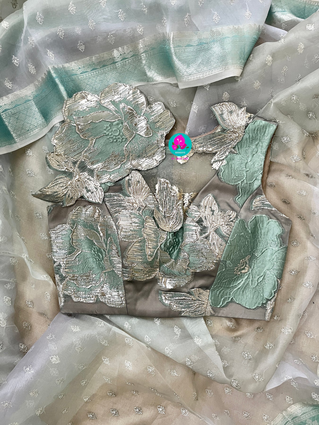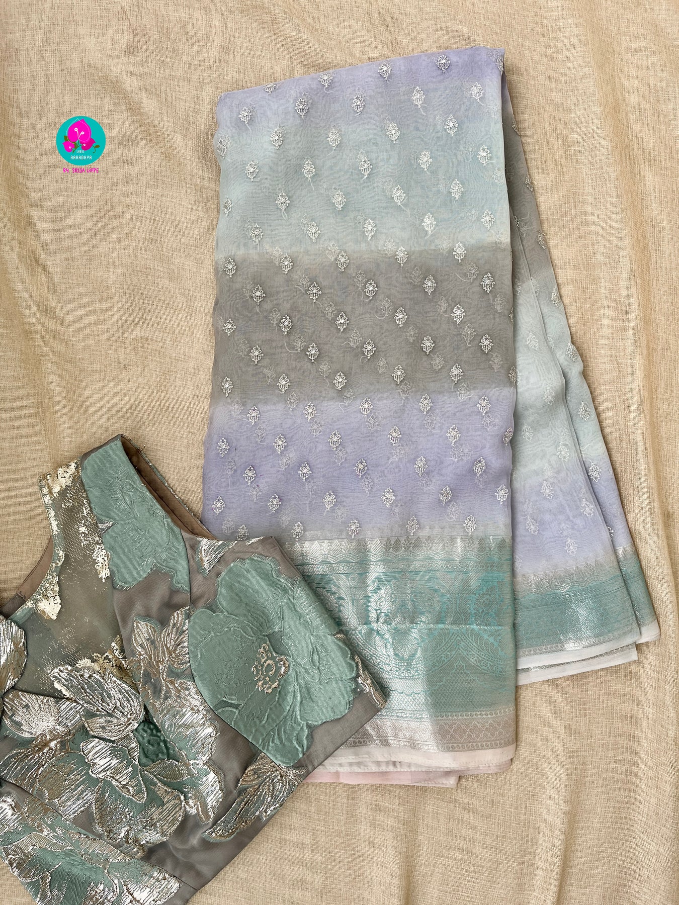 A drape that makes you fall in love with it! Hued in Rangkart crafted from delicate Kora is graced with finest hand styled with pure Polka Dots work throughout the body and the special hand woven silver zari long borders on both sides of the saree.