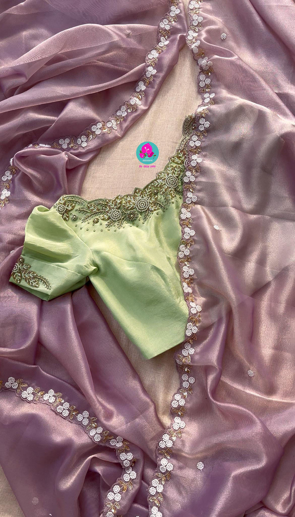 We call it a cocktail soft tissue silk saree with a flowy drape, paired with a hand embroidered blouse in matching tissue