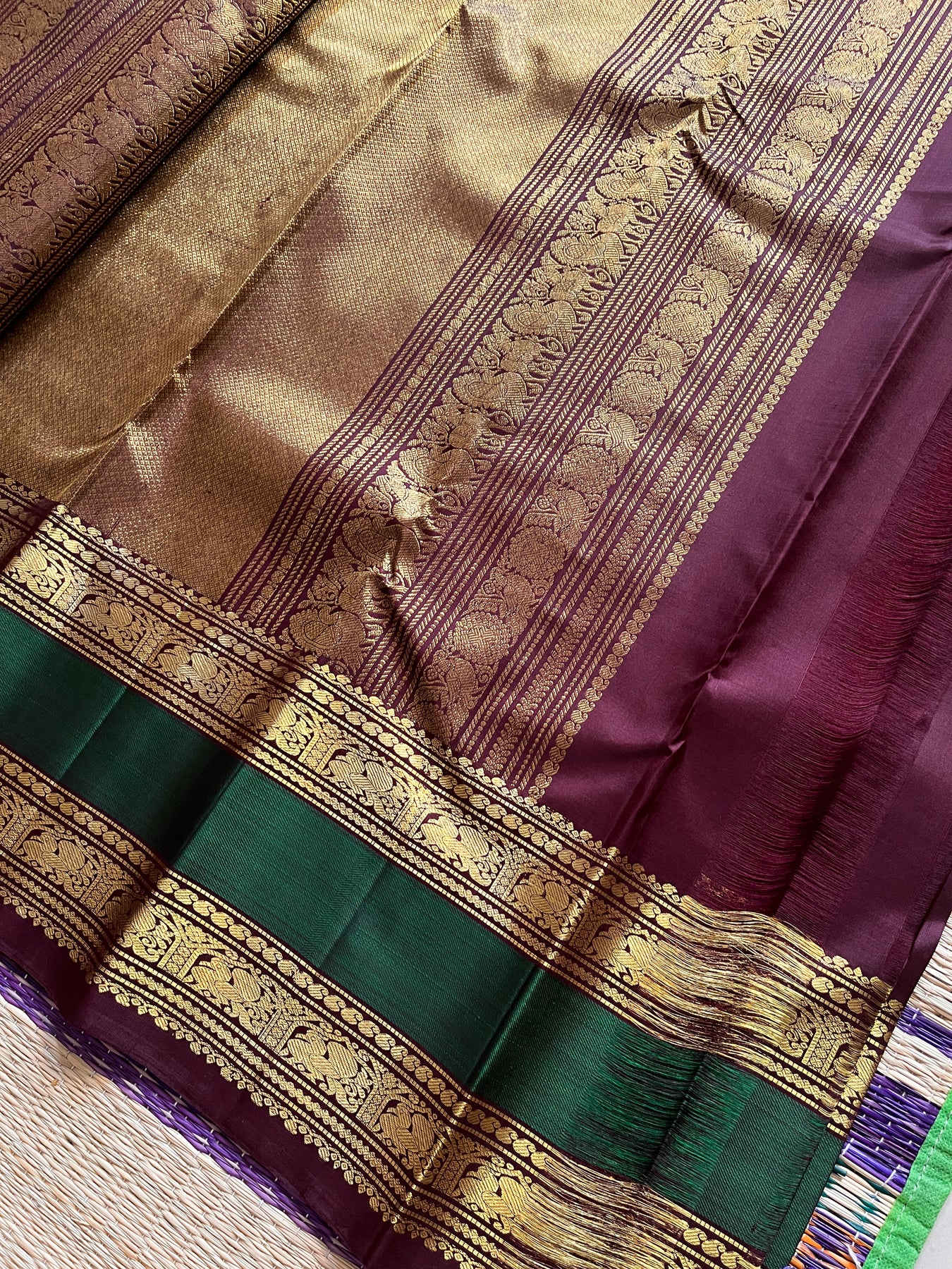 2g Zari Kanchipattu saree in Brown and bottle green