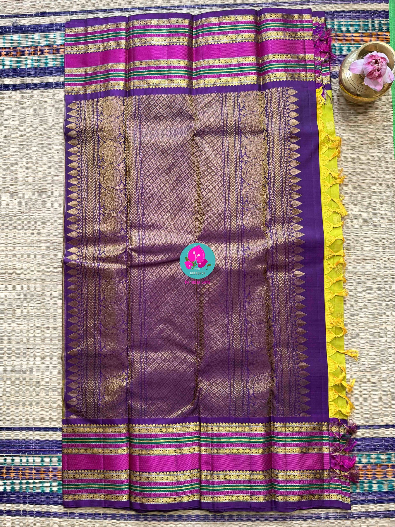 Woven in pure Kanchipattu silk, both timeless and free, This cheerful combination is a rare beauty to see. It holds the vibrant joy of day in its fold, Accented by passionate hues, a story of gold.