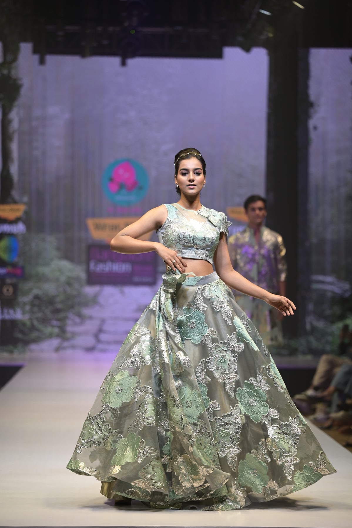 This Floral Jacquard Organza Lehenga for Sangeet is expertly crafted from delicate organza fabric with a beautiful floral jacquard design. With its elegant appearance and luxurious feel, this lehenga is the perfect choice for a sangeet ceremony. Add a touch of sophistication to any special occasion with this stunning piece.