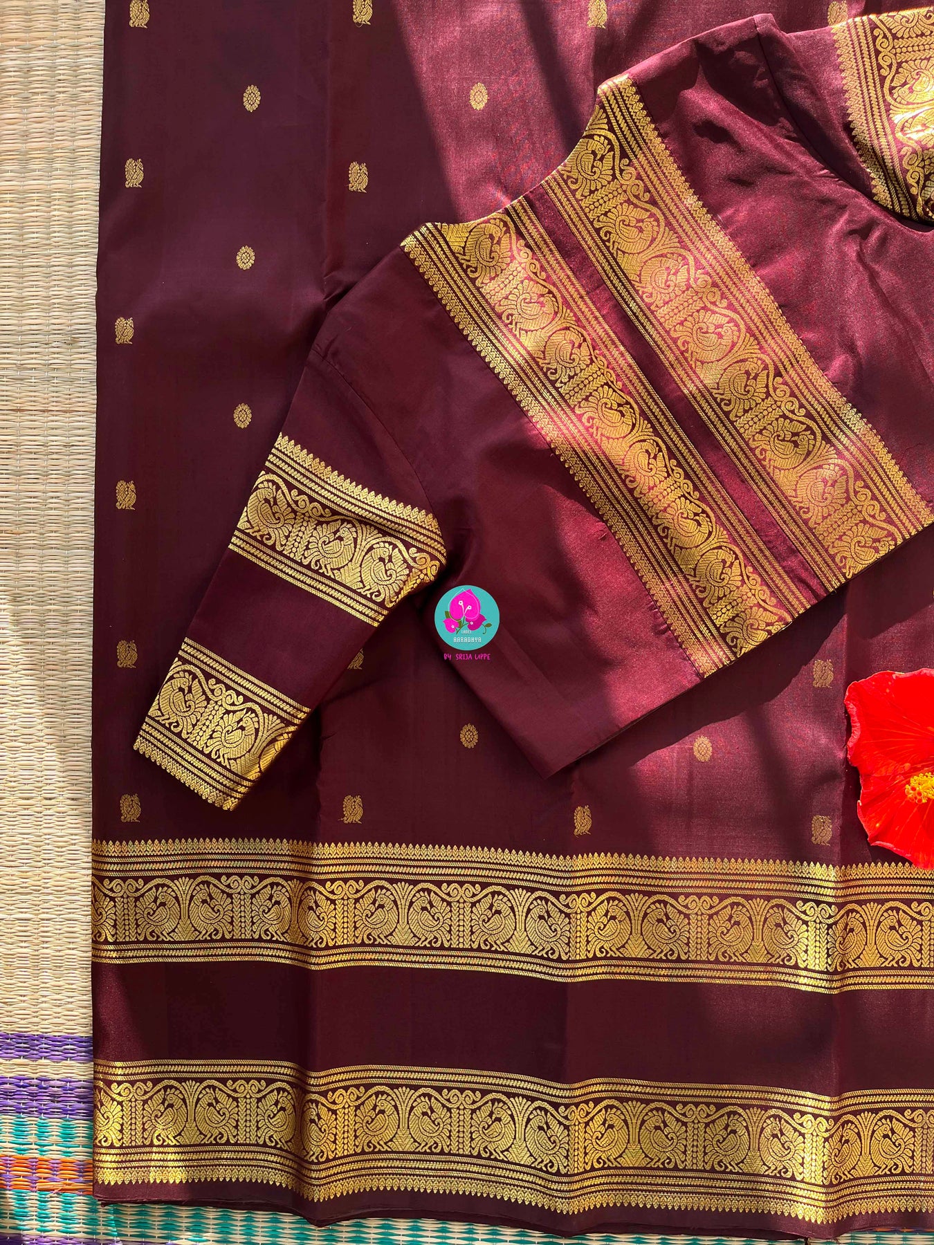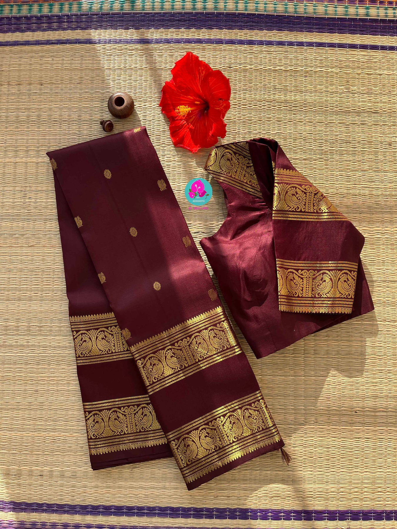 Kanchipuram 2g zari brown vintage saree with gap border and blouse