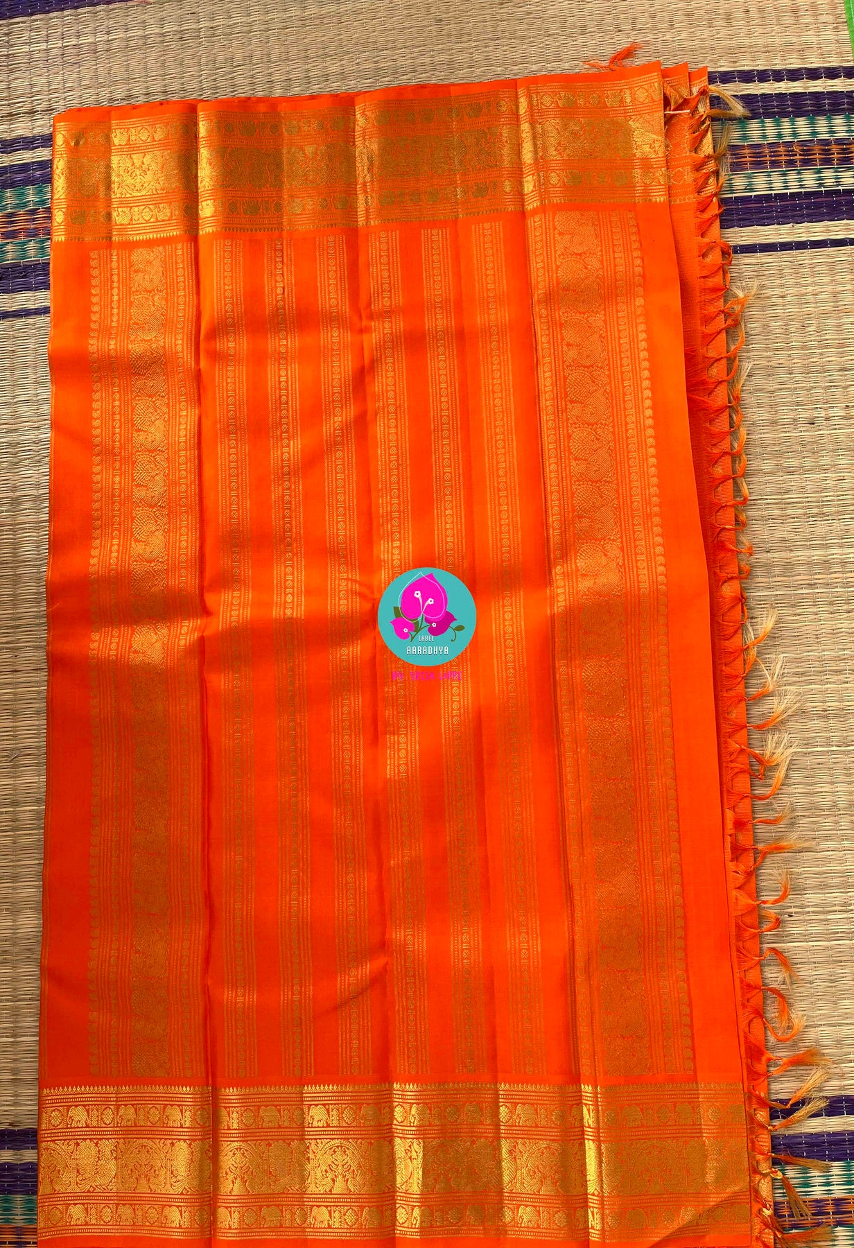 The saree is beautifully adorned with the intricate 3G zari traditional Vaira oosi design, a signature pattern that adds a touch of classic sophistication. The generous use of zari on the border and pallu gives the saree a magnificent sheen, making it a perfect choice for any grand occasion. This comes along with hand embroidered stitched blouse.
