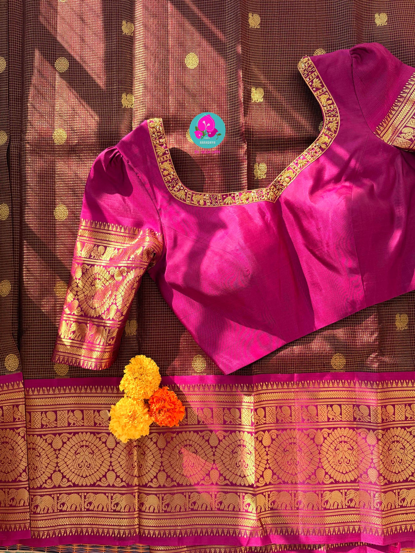 Pure Kanchipattu treasure in deep brown and Magenta color paired with hand embroidered blouse