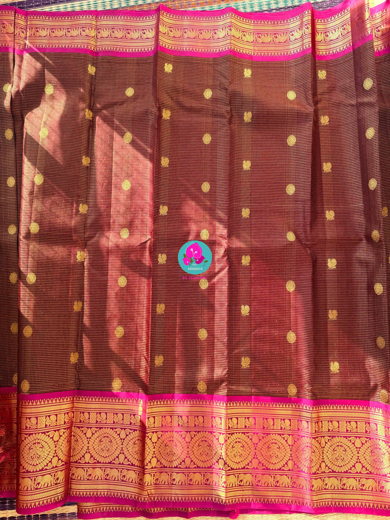 From Kanchipattu's looms, a treasure so grand, A vision of beauty from a magical land. The saree's pure body, a deep, serene deep brown hue, Like earth's rich dark soil, exquisitely new. With subtle textures, like whispers of light, And golden buttas, catching every bright sight.