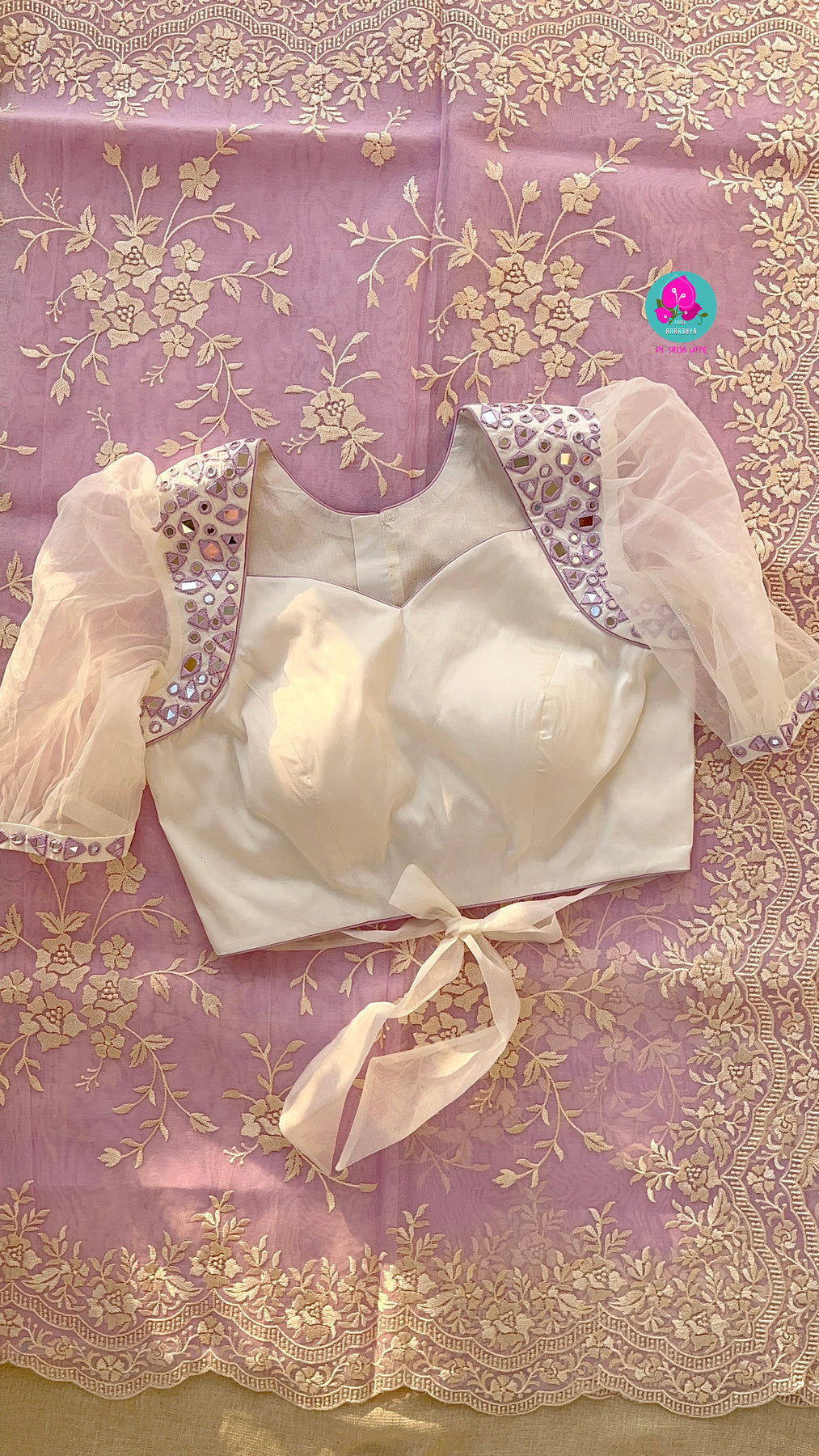 Add a touch of elegance to your wardrobe with our Thread Embroidered Organza Saree paired with a maggam worked real mirror blouse. Shop the look for a sophisticated and glamorous ensemble that is sure to turn heads. Elevate your style and make a statement with this stunning saree and blouse combination.